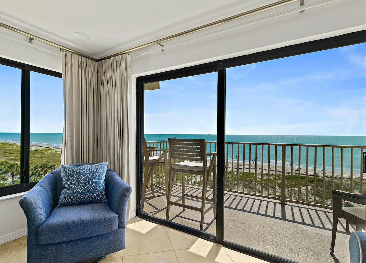About this space Second floor beachy boutique style large studio overlooking the ocean. This space can be very bright or draw the blinds for a dark cozy nap. Updated kitchenette with all the essentials. Great surf break steps away. Downtown is about a mile away.. World famous Cocoa Beach pier is about five. This chill space is a compound for a multigenerational family.