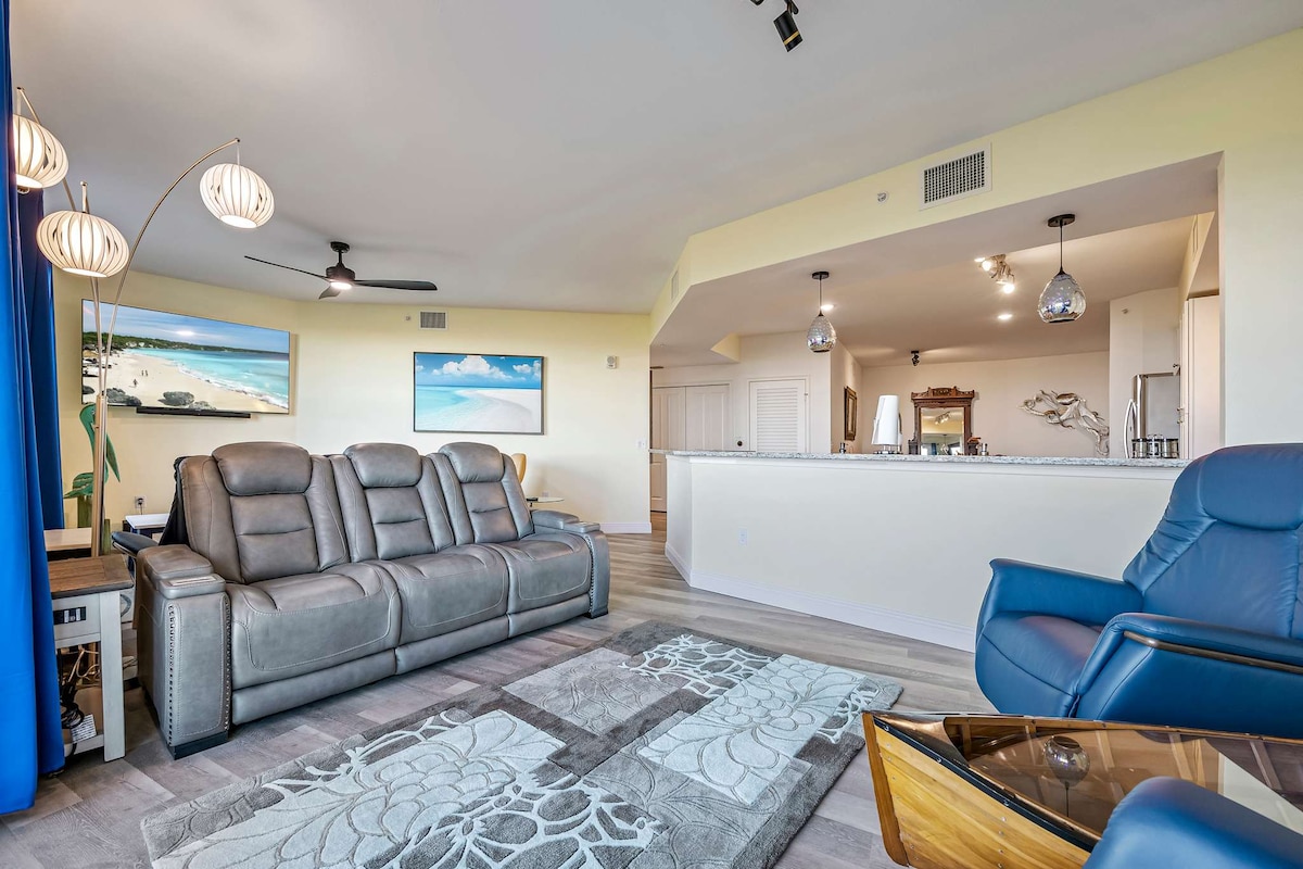 Cape Winds 505 is proudly managed by ‘Happy Palm Stays’, the top vacation rental manager on the Space & Treasure Coasts! Fully renovated with a stunning top floor oceanfront view! The private balcony has a high top table and 4 chairs, so you can sit and enjoy the stunning views & the sound of the waves. The master bedroom has a king bed with memory foam mattress,TV, en-suite & closet. The guest bedroom has a new queen panel bed with memory foam mattress, TV & closet.