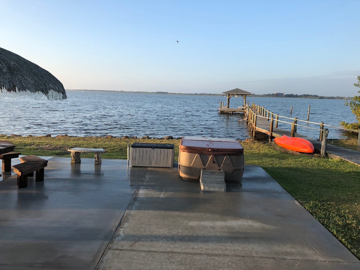 Welcome to the Florida lifestyle. This true river front one bedroom home in a upscale surrounding will be all yours. Just park the car feet from the front door and start enjoying the Florida weather. Fishing swimming kayaking from the dock welcome to bring your boat. The over size deck has tiki table fire pit and hot tub to enjoy the beautiful Florida days and nights. Five mins from the Beach/NASA Space Center/Port Canaveral and 45 mins from Orlando/Disney. Over 10 restaurants within 1 mile