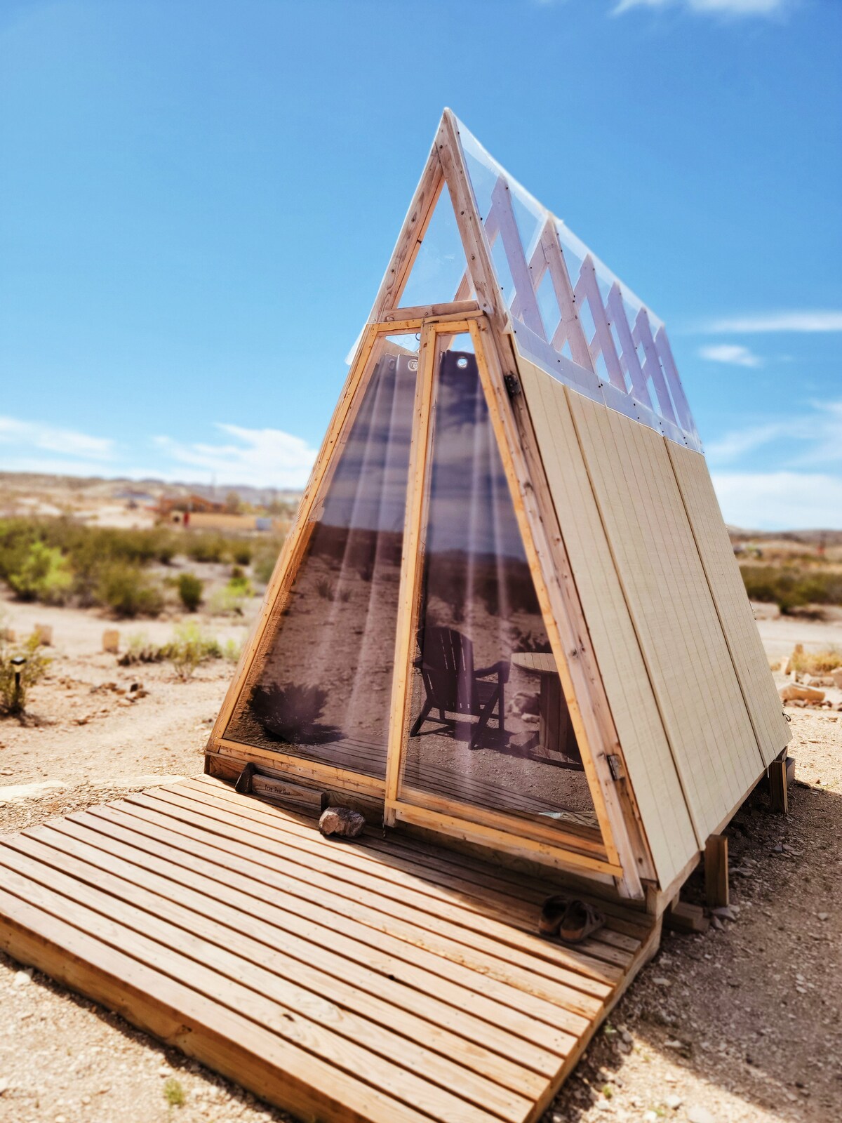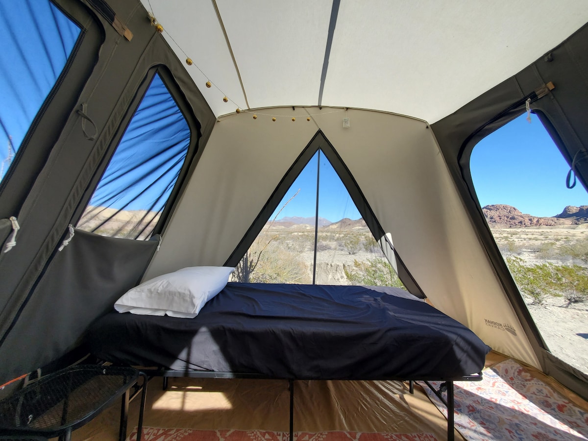 The "TW" Glamping Tent is part of Cholla Ranch Camp. A 15 ac section of a 1,100 acre working ranch where horses still roam free. Dedicated to relaxing: large walk-in shower, Aromatherapy nook, foot massager, yoga mats & more. Located in the Chihuahuan Desert of Far West TX just 1 mile from Alpine. The TW is equipped, with a queen sized bed, organic bedding, toasty gas heater in winter, microwave, dorm size refrigerator, record player, vintage games, books, coffee, tea & white noise machine