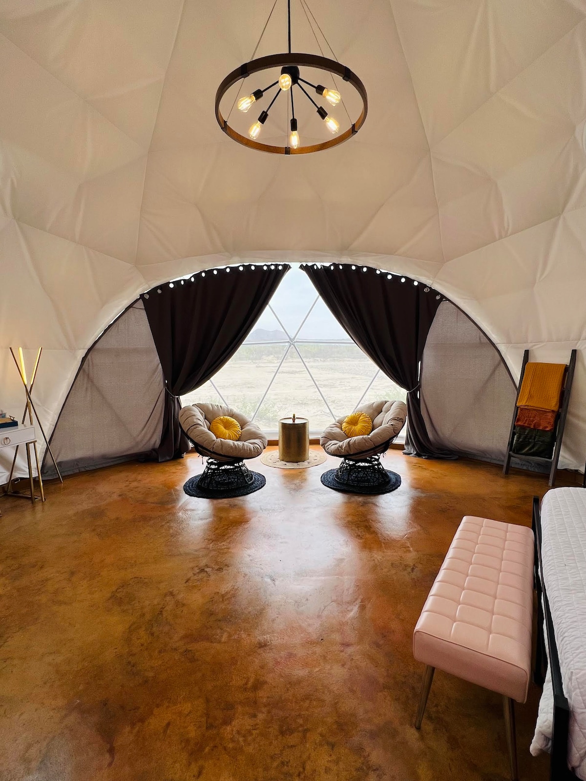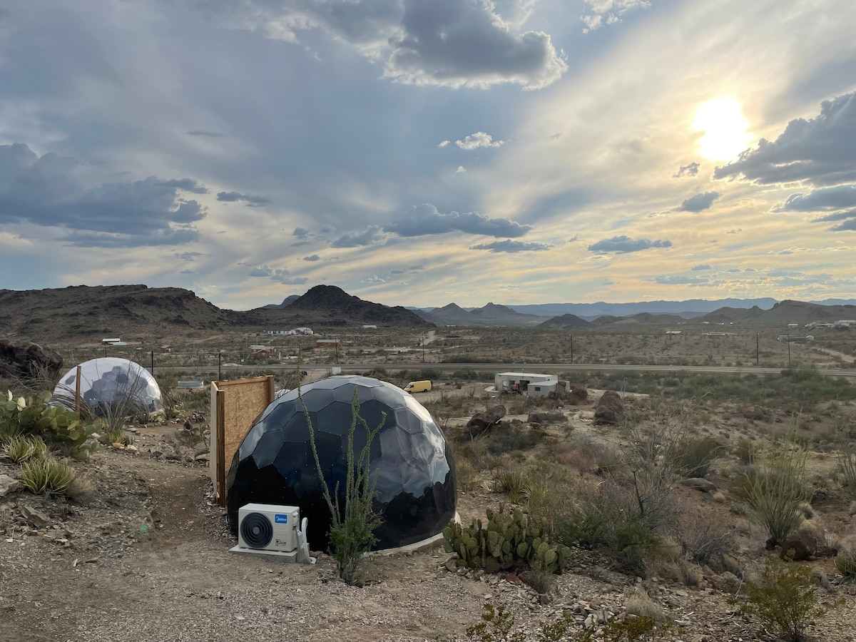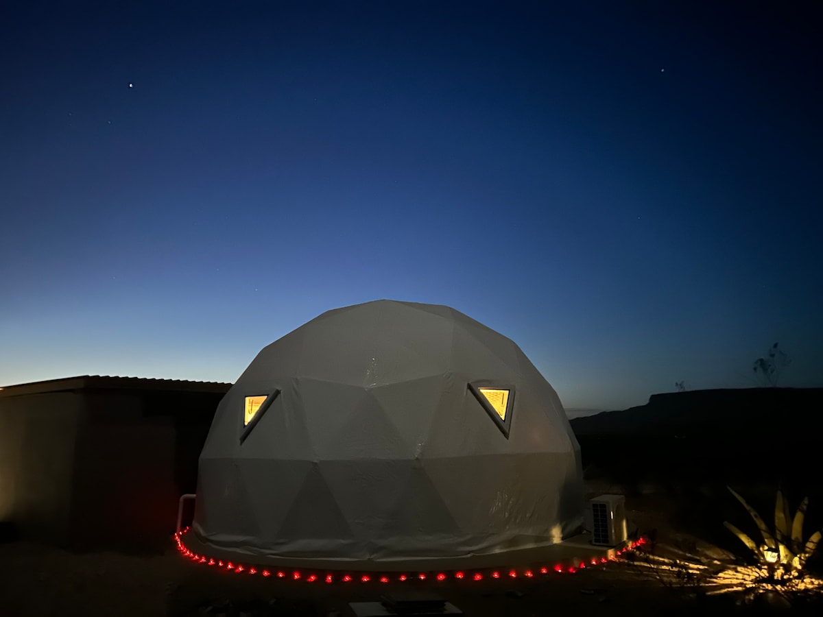 This solar-powered glamping dome is the perfect place to lay your head while exploring the Greater Big Bend region. Located ~30 minutes from Big Bend Park entrance. Quiet and safe rural area. Spa-inspired interior bathroom with walk-in shower, vanity & toilet. Private outdoor kitchen & shaded dining area. Touch-on fire pit to keep warm & a telescope to enjoy the stars. Mini-split to help cool & keep the night chill at bay. Mini fridge, microwave, coffee bar & so much more!