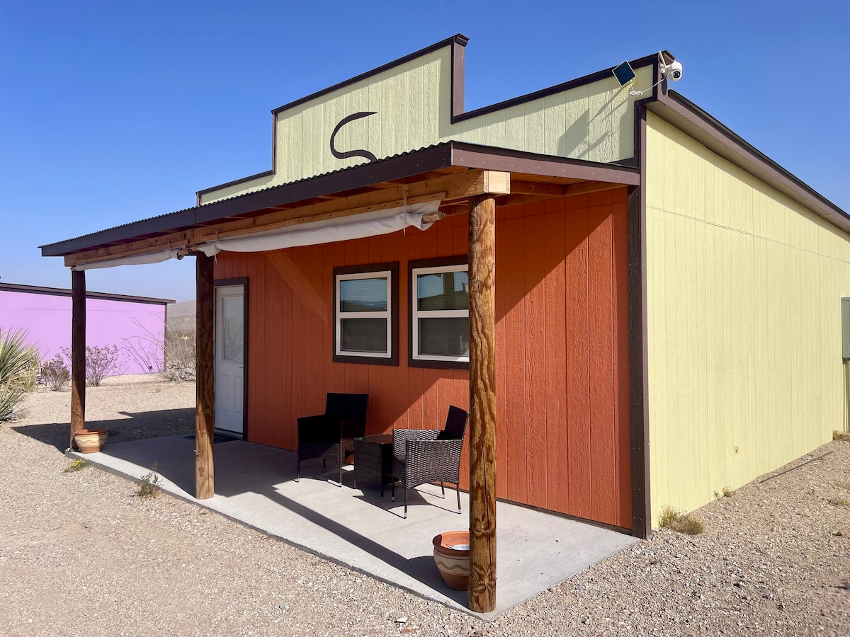 *10 MINUTES TO BIG BEND NATIONAL PARK *Private, but near everything! *Locally owned/operated! *324 sq ft charming Eco-friendly cabin for 2 adults (no kids) *COLD A/C, heat *Indoor&outdoor showers *Gas log fireplace *Super comfy Queen bed *Kitchenette *Full bath & clean compost toilet *Stunning views of Big Bend National park *Sustainable, SOLAR powered *Sunrise mountain views from your pillow *Incredible stargazing! *Come enjoy this unique desert gem, make memories of a lifetime!
