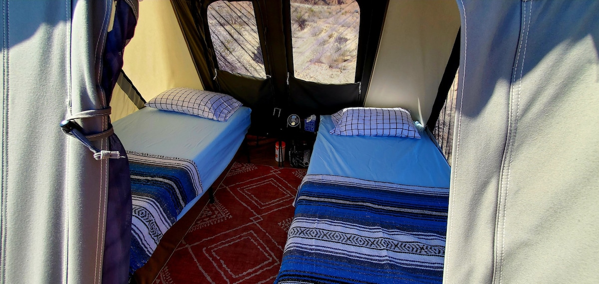 Come unwind your knotty soul in this spacious safari tent just 10 minutes from Big Bend National Park. This listing is a chance for smaller groups to book a single tent at our most private group site. If booked, the other tent is automatically blocked from booking, so you will have the entire site to yourself, including the stocked kitchen tent. If you decide to add more folks to your group, the other tent with 2 queen beds can be booked any time!
