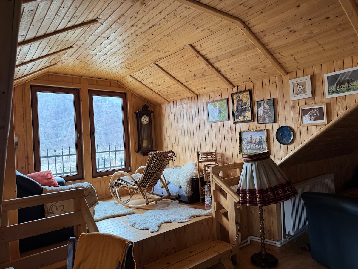 O mansardă construită din lemn, mobilată și decorată cu obiecte vechi autentice, care îi oferă un farmec aparte. De la fereastra living-ului te bucuri de priveliștea către râul Olt, iar spațiul este situat într-o curte mare și liniștită.