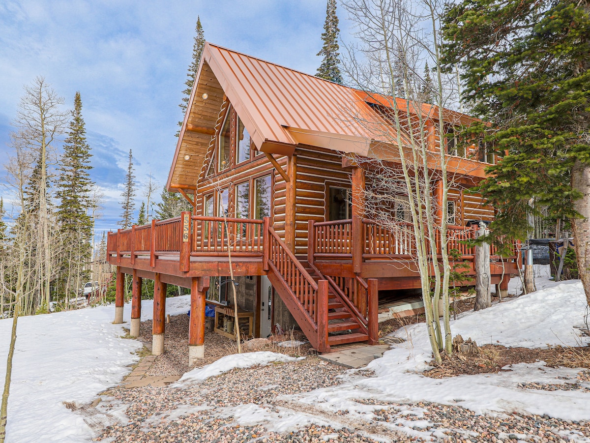 Enjoy our 3 bedroom, 1.5 bath cabin with the most perfect view of all of Brian Head! The first floor has 2 bedrooms, one with a full/twin bunk and one with a queen bed. Laundry, a half bath and a perfect game room complete the first floor. Upstairs is the fully stocked kitchen, dining and living room with a gas fireplace, full bathroom, master bedroom and a deck with incredible view! You’ll enjoy the hot tub under stars and the wonderful convenience of being less than 4 minutes from the slopes!