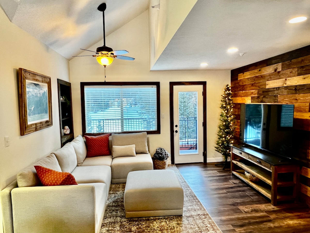 Freshly renovated condo in The Ridges at Chalet Village across from Brian Head Resort - Giant Steps. Highest rated 2-bedroom in Brian Head! THE most amazing views in town and faces the sunshine all year! Private balcony. 1GB fast WiFi, wood fireplace (including firelogs). 50" TV with all the streaming you'll need. Washer/dryer in our unit; dry out those wet snow clothes each night. All new comfy beds. All the kitchen and bath amenities you'll need. Come have a 5-star vacation!