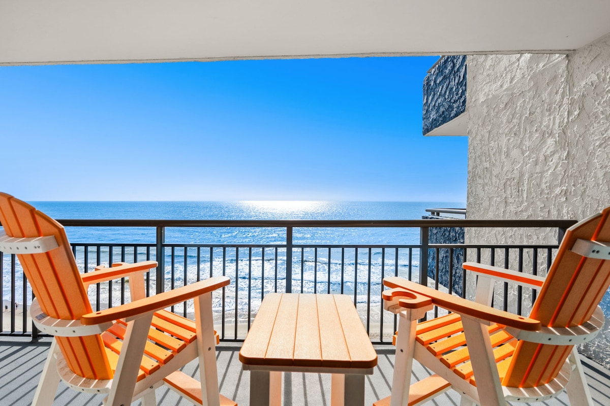 Kick back & relax in this updated oceanfront condo at Beach Colony Resort. Featuring modern furnishings, a plush king bed, sleeper sofa, fully equipped kitchen, & a spacious bath, this retreat has everything you need for a peaceful getaway. The resort has something for everyone w/ amenities like heated indoor & outdoor pools, hot tubs, lazy river, tiki bar, restaurant, coffee & gift shops, fitness center, sauna, arcade, & beautifully landscaped lawns w/ umbrellas, hammocks, loungers & gliders.