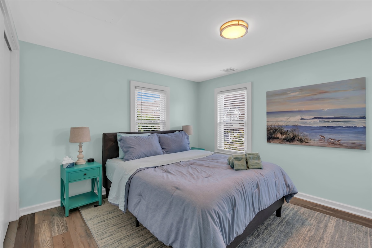 Have fun with the whole family at this beach home charmer! This home has a ton of space! 2 floors. Upstairs full bth & 3 bdrms. Downstairs sun rm, dining rm , living rm, kitchen & half bth. *Back cottage (Not included) ask host about adding *see gameroom pics (bunks, full bath, kitchenette, & sleeps 4). Outside: Outdoor shower. Large fully fenced in backyard w/ fire pit & grill, sit back & relax. Mins from beach, park, boat & jet ski rental. Tons of parking at beach. 5 beach passes included