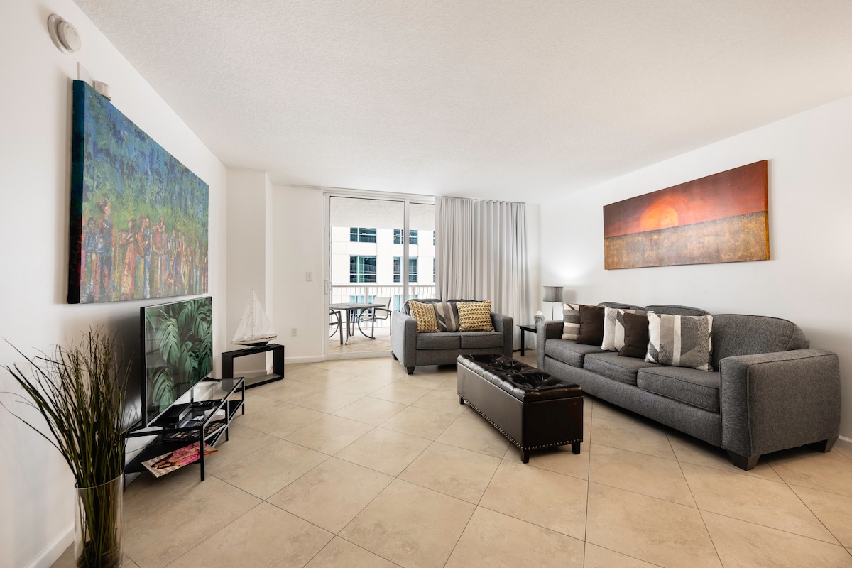 Oceanfront Condo Balcony Kitchen pool gym Beach.