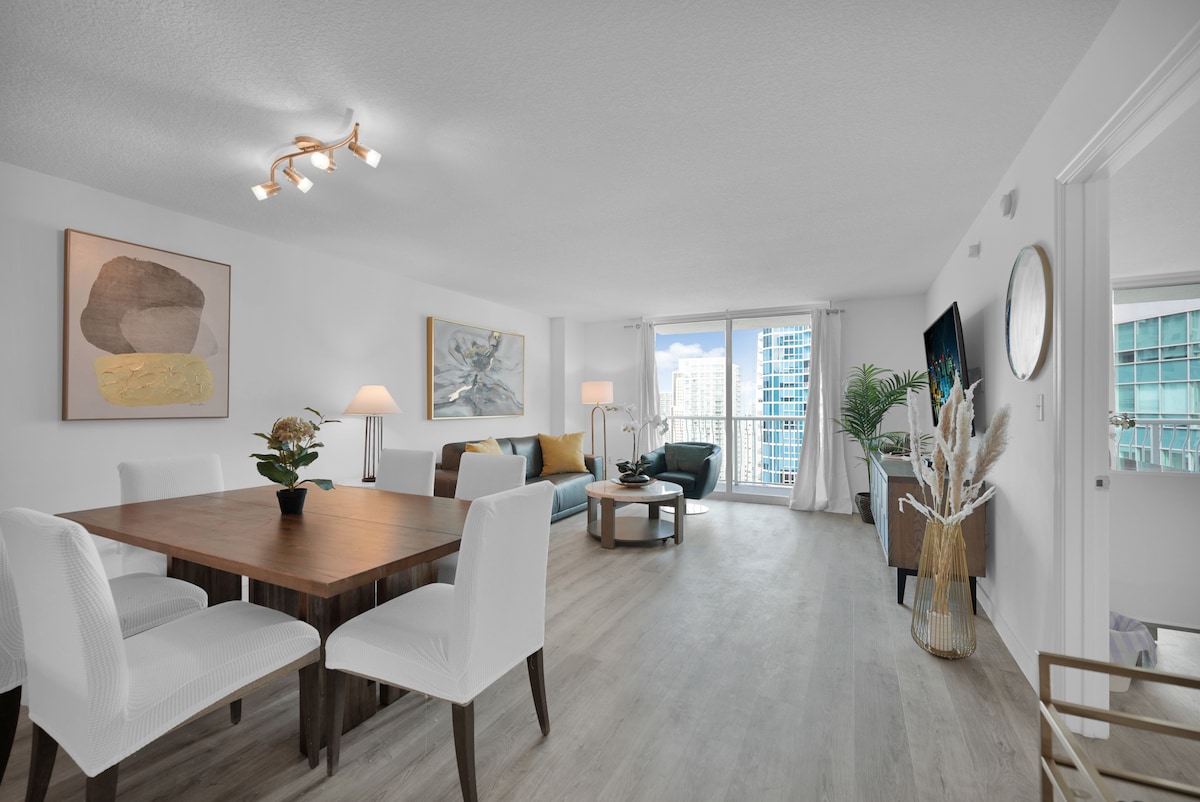Our unique 5-star HIGH floor corner unit condo is fully furnished with an equipped kitchen located on one of the highest floors at the W Hotel which has the biggest SWIMMING POOL in Miami. We are centrally located along the Miami river with amazing sunset views. Walking distance to City Centre Mall, Whole Foods, restaurants and bars. Just a short drive to the design district & south beach. THIS IS THE PLACE TO STAY! Airport transfer, housekeeping, car rental available based on availability.