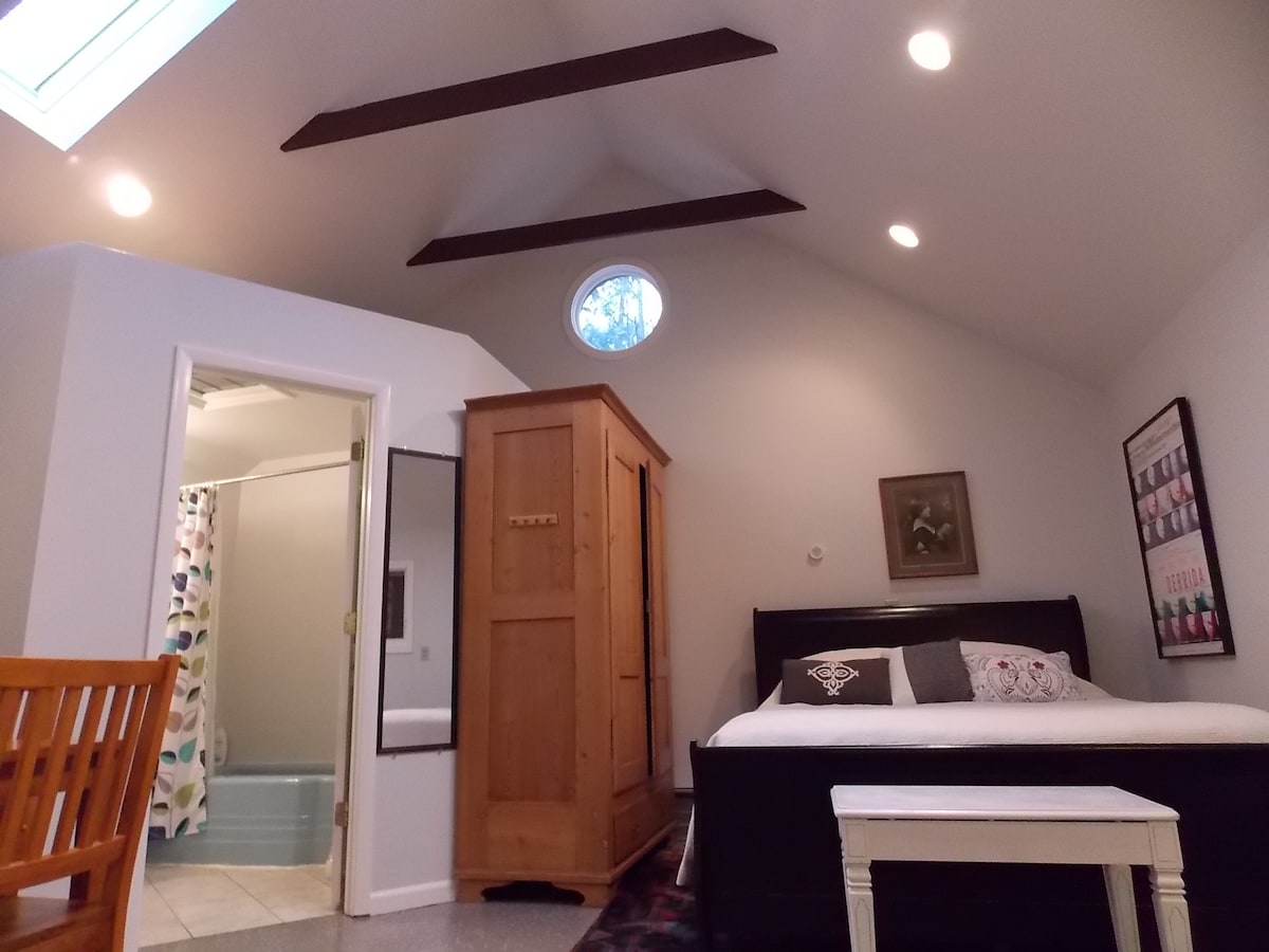 We look forward to welcoming you to a private suite that is the guest quarters in our home. You’ll have a private entrance & 3 rooms to yourself. There’s a living room with a table and chairs, a bedroom with a queen-size bed - nightstands, dresser and closet space with hangers for your use - and a newly remodeled full bathroom. There’s also a kitchenette in the hallway which is an antique Hoosier Cabinet equipped with a microwave, mini-fridge, coffee pot, and hot water pot.