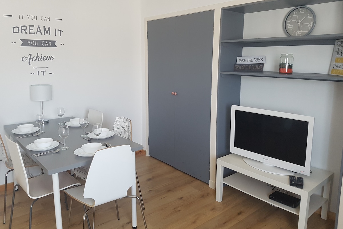 Recently renovated, our one bedroomed apartment is located a mere 10 minute walk from Aberdeen city centre along George street, a popular area with many unique shops. Spacious double bedroom with king size bed, 50" TV, wardrobes, chest of drawers, dressing table and floor standing full length mirror. Semi-open plan kitchen/lounge with ample seating, breakfast area and smart TV. Bathroom with luxury rainfall shower over bath. Bus stop 2 mins walk and free on street parking.