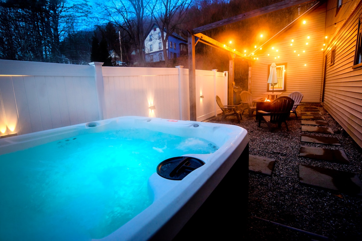 Walk to everything from this sunny, spacious 2-level, newly renovated 3rd-floor loft in downtown Shelburne Falls, right by the Bridge of Flowers. Cathedral ceiling, giant windows with views of mountains & river. Open upstairs queen bed space. Comfy pull-out queen bed downstairs. Washer/dryer. Well-equipped kitchen w/ dishwasher. Brand-new tiled shower. Fast Internet, two smart TVs, and a 15,000 BTU air conditioner that cools the big space in minutes. 15-minute drive to Berkshire East ski resort.