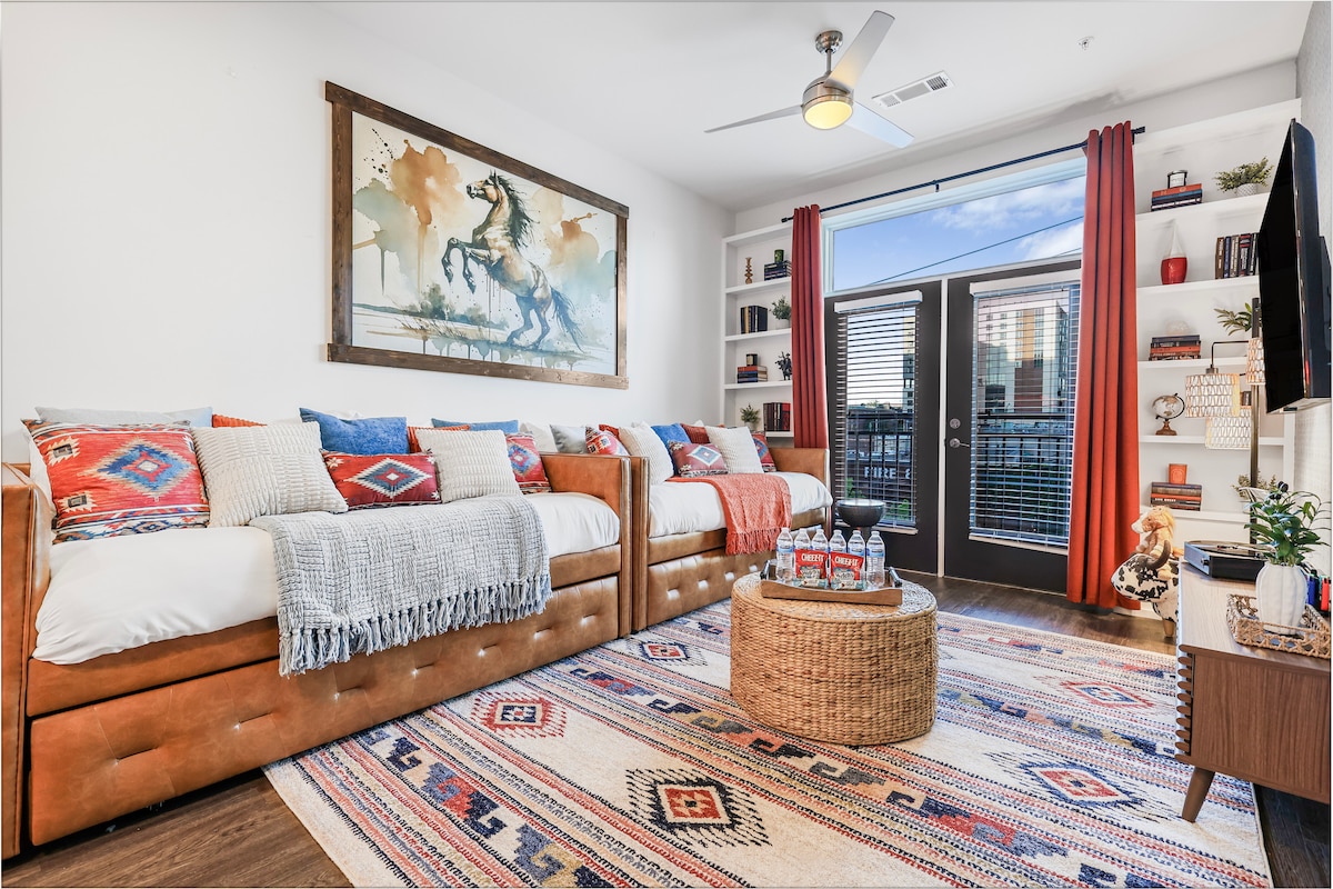Welcome to Boots & Broadway🩷just 2 blocks from Broadway! Our cozy studio is sure to make you feel right at home with a well-equipped kitchen, 2 Queen Memory Foam beds, 1 Queen Deluxe Plush air mattress, extra pillows & blankets, coffee bar, toiletries and so much more! Our studio is ideal for solo travelers, couples, or small groups. Guests will have access to the outdoor heated pool, fitness gym/rock climbing wall, grills & courtyard. Just a short walk to downtown Broadway/Ryman/Bridgestone