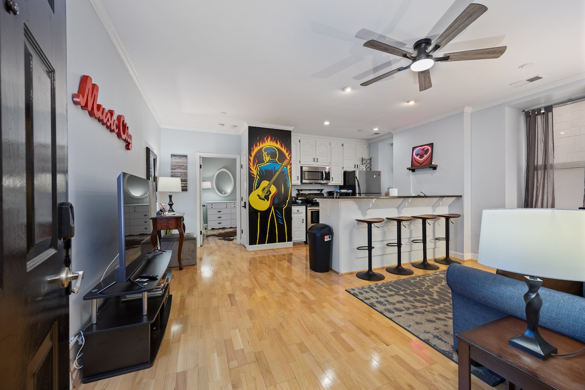 This professionally designed studio is minutes from Nashville’s top venues and just 2 miles from the Broadway - perfect for concert nights and couples’ getaways. Guests often say this is one of the cleanest stays they’ve experienced. Enjoy reserved parking, easy self check-in, a fully stocked coffee station, high-end finishes, a spacious walk-in shower, and a comfortable home base close to it all.