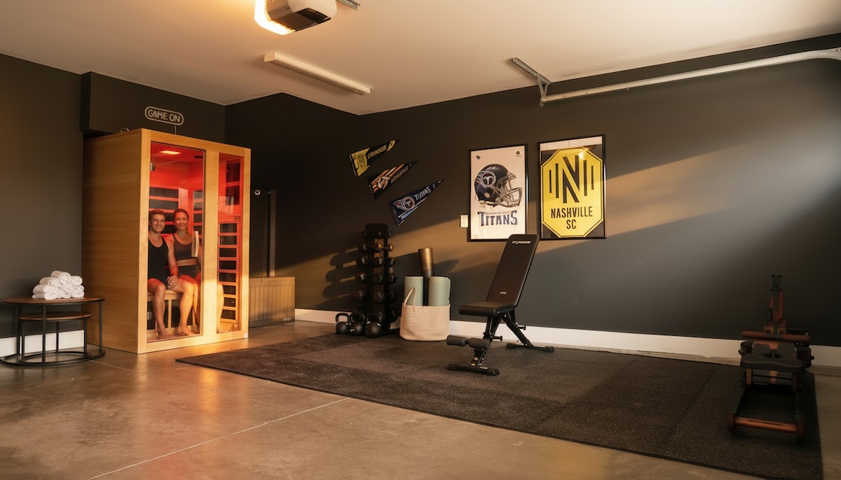 🔥Experience Nashville in style at Moxie Manor🔥A NEW spacious upscale 4BR/4BA home near Broadway w/ private rooftop hot tub, firepit, grill, and skyline views. PERFECT for family gatherings, birthdays, reunions, + group getaways (bachelor bachelorettes). Sleeps 12 comfortably, with ensuite baths, a rooftop pool table, a wellness room with sauna, and a gourmet kitchen. Designer interiors, smart TVs in every BR, free parking, and fast access to amazing restaurants downtown, 12 South + The Gulch.