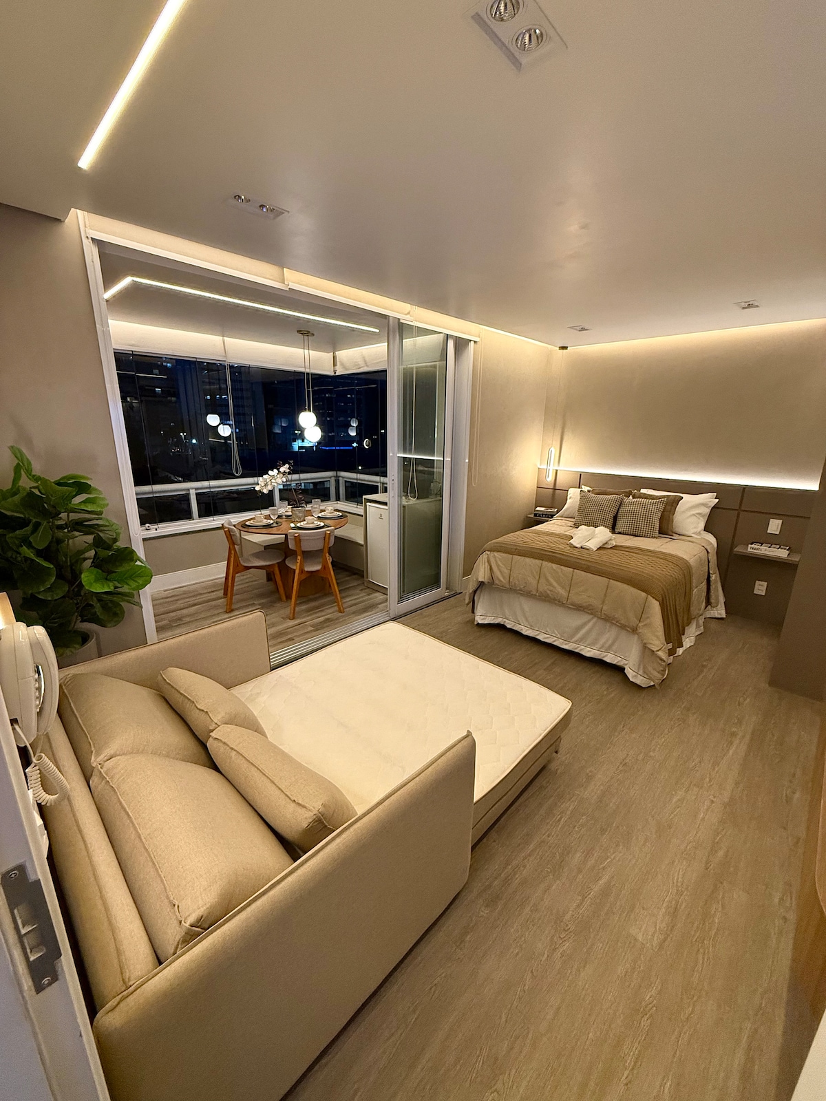 Estúdio moderno e ensolarado com cama queen size