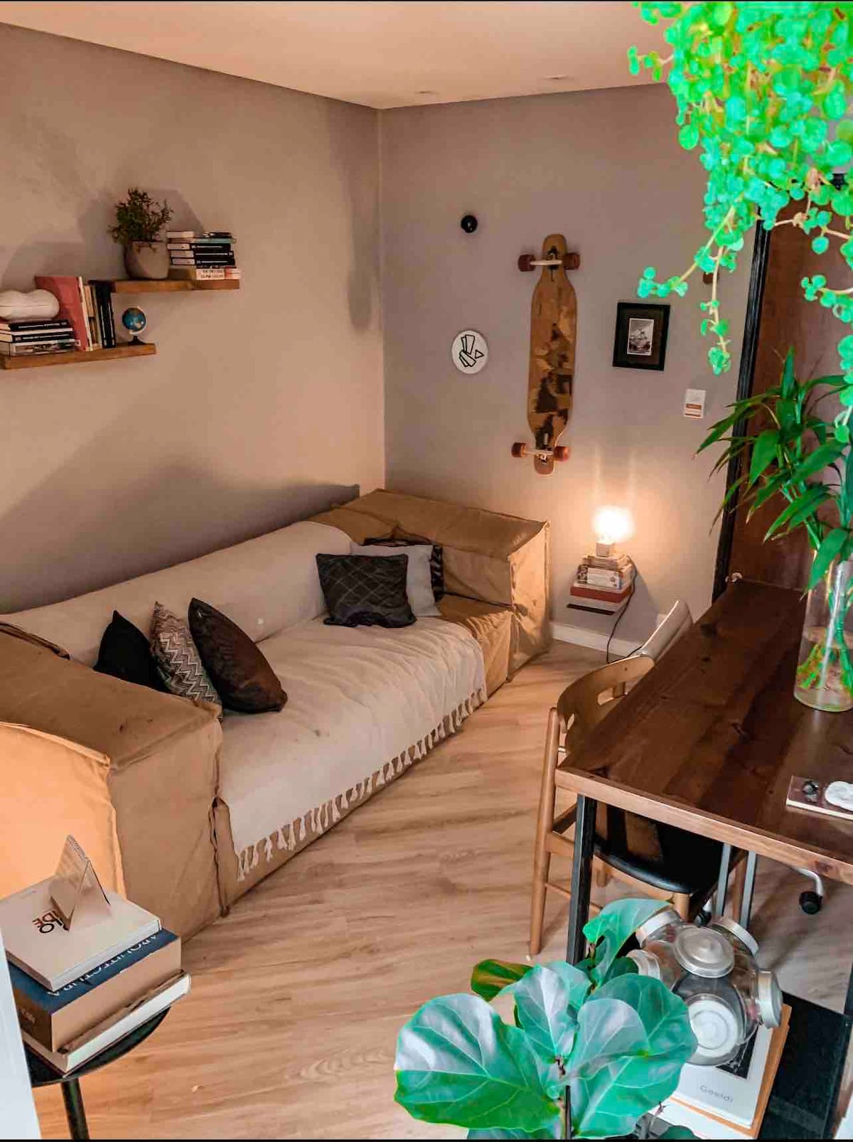 Open the door and step inside… "Uh uh, que beleza" in the heart of the concrete jungle. The greenery and cozy atmosphere reveal the Brazilian rhythm of this retreat. Every corner invites you to feel, dream, and be inspired by the sounds of Brazilian classics on vinyl. This is your place, for work or to experience São Paulo, because there is love in SP. The house pulses with life, with the freshness of plants, the poetry of books, and the gentle rhythm of bossa that accompanies every moment.