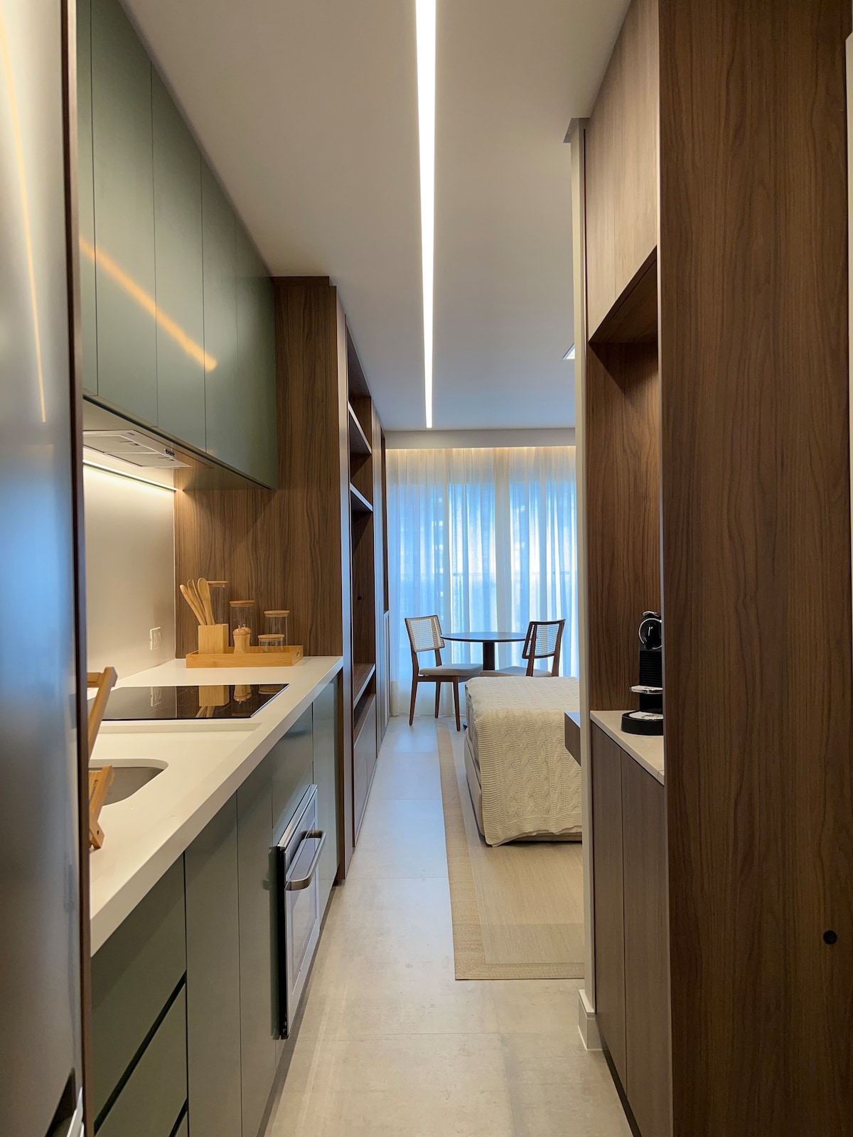 Studio perto do Pq Ibirapuera com decoração moderna, iluminação led embutida, proporcionando conforto e bem-estar. Porta c/ fechadura eletrônica, ar-condicionado, cortinas c/ blackout. Portaria 24 horas Rua pequena e arborizada Wi-Fi, piscina, sauna, academia, bicicletário Torneira com bica separada com água filtrada Colchão (casal) Simmons com box baú Cadeira de trabalho Herman Miller Smart TV Samsung 65" Cafeteira Nespresso Citz Cooktop Microondas Máquina de lavar e secar roupa