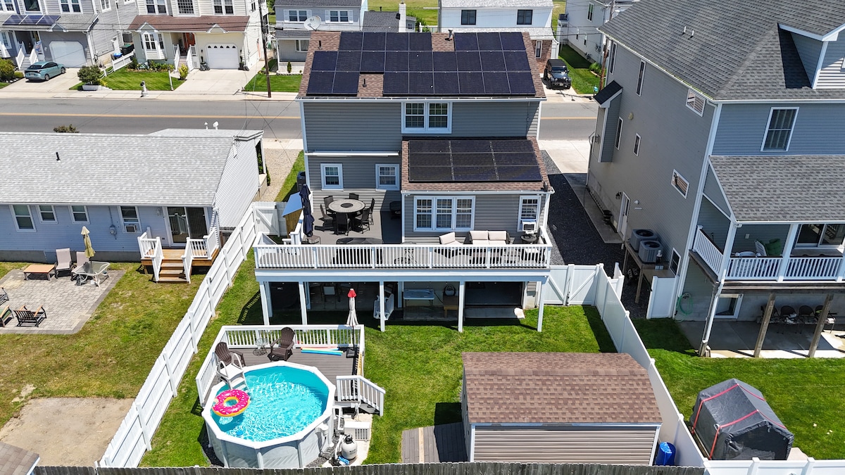 This spacious beach house is perfect for families, offering 3 bedrooms plus a bonus room with a queen bed, a living room and a den. Enjoy the fun game room with more sitting area, TV, ping pong, cornhold, dartboard, indoor basketball and a poker table. Enjoy the above ground pool and great outdoor space with a fire pit and dining table and outdoor shower. The home also offers an elevator/lift from the ground floor to the main floor for easy access . Just 3 blocks from the beach.