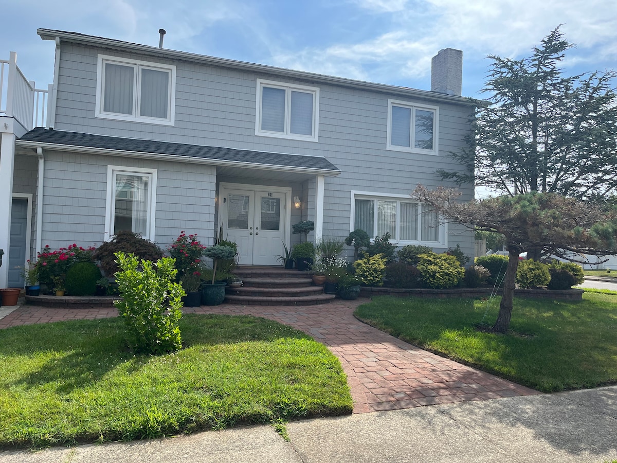 BAYFRONT sunset views, DOCK & BOAT SLIP, 3 BR townhouse, 6 min walk to beach. 2 decks, 2 KAYAKS, paddle board, 2 driveways, WiFi, 50 inch TVs w/Samsung +, Netflix, Max, Hulu, Prime, Disney. 2 King beds, 1 full bed. 2 Pack n Plays. Keyless entry. Outside shower, grill, big back yard. All new Raymour & Flanigan beds, mattresses, & furniture. Beach cart, 4 tags, chairs, umbrellas, toys. Linens/bedding/ bath & beach towels, keurig. Sleeps 6 + 4 kids- 2 PNPs, 1 air matt & cot