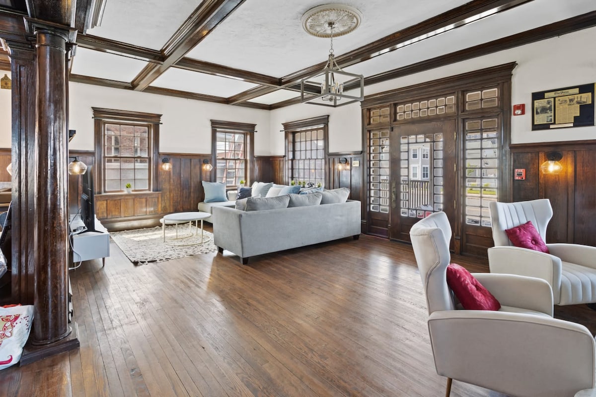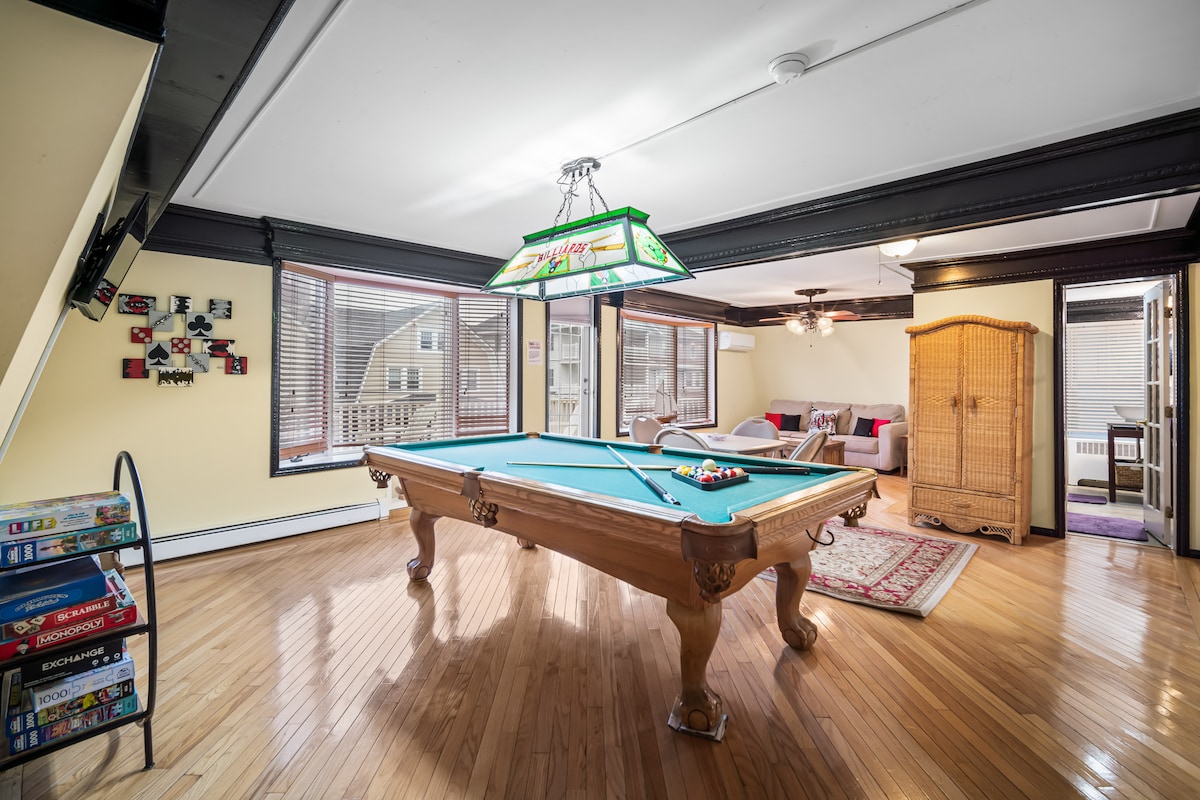 Transport yourself back in time at our beautifully restored, majestic historic home nestled just a few steps from the famous 4-mile Atlantic City Boardwalk! A perfect escape to host your next family vacation or group gathering among friends, the 4,000 SF home features (8) delicately furnished bedrooms, 6-1/2 spacious bathrooms, original hardwood floors, a gorgeous solarium, and relaxing ocean views. Craving Atlantic City’s world-class entertainment and dining scene? We are a 10-minute walk al - A blend of comfort, class, and convenience awaits you as soon as you step through the front door. The spacious living area, characterized by large windows showering the space with natural light, will immediately welcome you with plenty of seating for the entire family. Adorned with tastefully picked décor, comfortable sofa and chaise, the living room is an ideal space for gathering. For your entertainment, there is a 65” Roku TV as well as a soundbar. The kitchen boasts beautiful granite countertops that add an appealing touch to the well-lit room. Fully equipped for all of your essential cooking needs, the kitchen features a variety of amenities such as a coffee maker, microwave, full stove/oven, dishwasher and offers a range of kitchenware and cookware you need to whip up a tasty meal during your stay. Right by the kitchen is a cozy dining area adorned with furniture featuring a vintage design that will make you feel like you're dining in a rustic café. The large table will seat up to (6) guests comfortably. Between the kitchen and living room is the spacious formal dining room, with seating for up to (10). The dining room is flanked by the sun-filled solarium, offering additional seating for a more informal dining experience. When you’re ready to cap off the night, choose from the (8) comfy bedrooms across the top two floors. On the second floor, there are (4) bedrooms, each of which consists of a king-sized bed on top of a canopy-style bed frame. Each of the king bedrooms also features its own ensuite bathroom stocked with all the essentials. The third floor features another (4) bedrooms with flexible sleeping arrangements: Bedroom #5: twin-over-full bunk bed with direct access to the third floor deck Bedroom #6: (2) twin beds with direct access to the third floor deck Bedroom #7: (1) full bed + a twin daybed w/trundle (twin) - no deck access Bedroom #8: (1) full bed + a twin daybed - no deck access The third floor offers (2) separate bathrooms with tiled walk-in showers. The entire house is served by a 3-zone central A/C system, so each floor is controlled by its own thermostat to maintain its desired temperature. The top floor is also on its own zone for heating. Several bedrooms do not have closets, but each bedroom has at least a dresser/chest of drawers. If you're working away from home - no worries! The house is equipped with high-speed Internet through Xfinity for all your Zoom call and virtual meeting needs. Our Internet plan calls for 800 mbps. For fastest speeds, your best bet is to plug directly into the modem/router in the living room, or to set up close to the router. While we do not tolerate excessive partying (particularly with guests who are not included on your reservation), we welcome bachelor party and bachelorette party groups. Please advise beforehand, and we are happy to make recommendations for your bachelor/bachelorette parties! We also welcome groups coming to town on golf trips, business/corporate retreats, family reunions, and milestone birthdays.