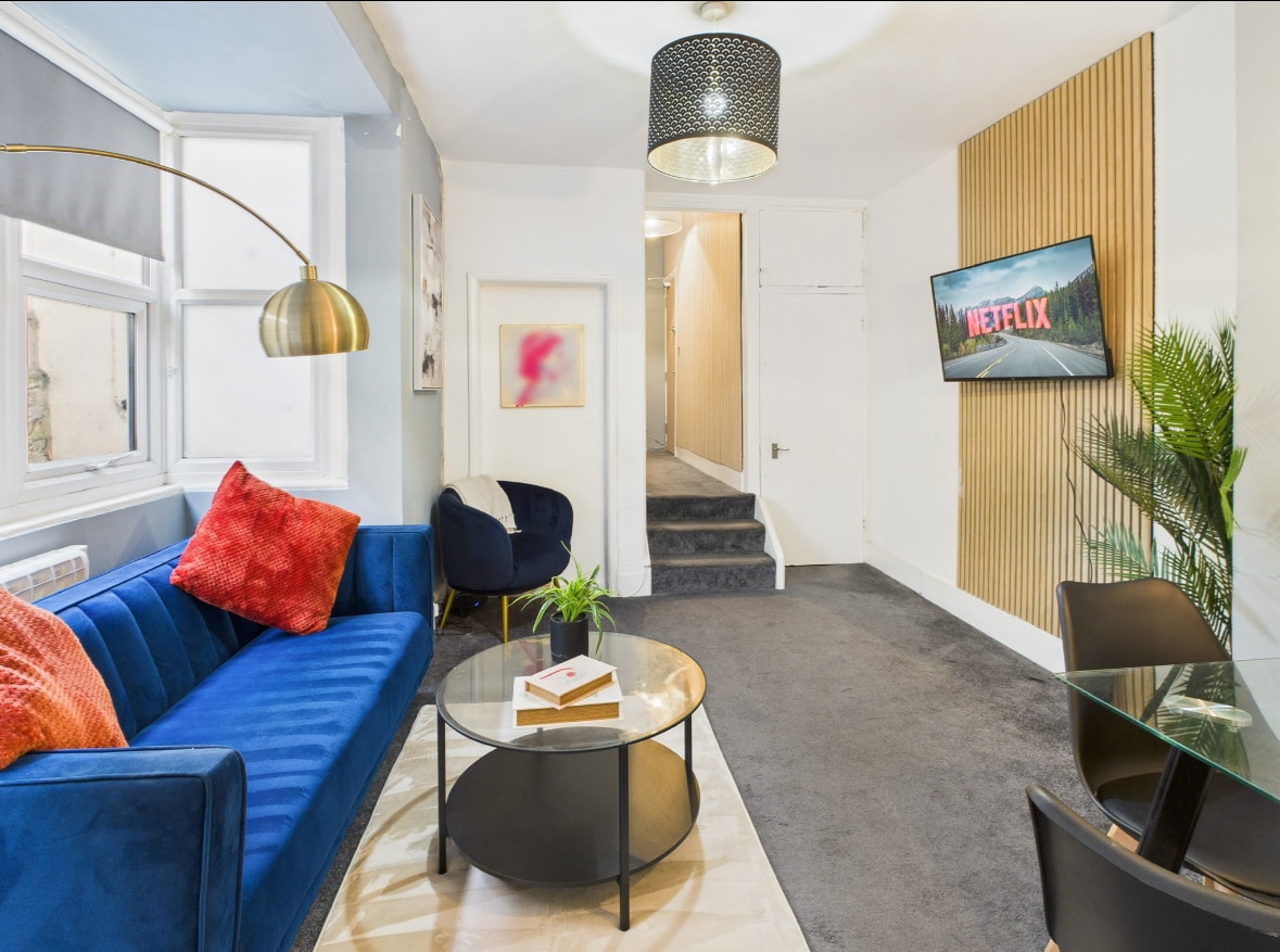 Bright, stylish 1-bed apartment with a spacious garden, ideal for sunny BBQs. Just 2 mins from the beach and 5 mins from Brighton’s center. Enjoy restaurants, bars, cafes, shops, and the beach right at your doorstep. Newly refurbished, the flat features a BBQ, a fully equipped kitchen, a dining/working table, and a cozy outside sofa, as well as an inside TV area with a smart TV and major streaming services. The bedroom has a king size bed and a large cupboard with hanging space.