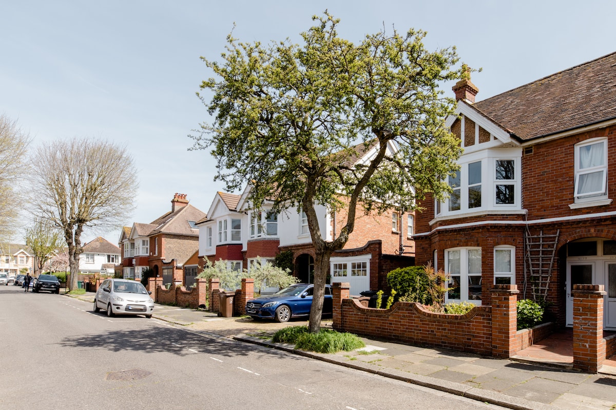 100+ amazing reviews: "super welcoming & stunning home" "Spotless & tasteful accommodation" "super clean and lovely neighbourhood with the beach a short walk away!" "a super comfy bed." "very friendly welcome from hosts. House on very pretty road!" "Easy access to Brighton via by bus or train" A pretty, light & comfy double bedroom with dual aspect windows over our pretty back garden, blackout blinds & your own bathroom next door. Guests comment on the super comfy bed! A warm welcome awaits!