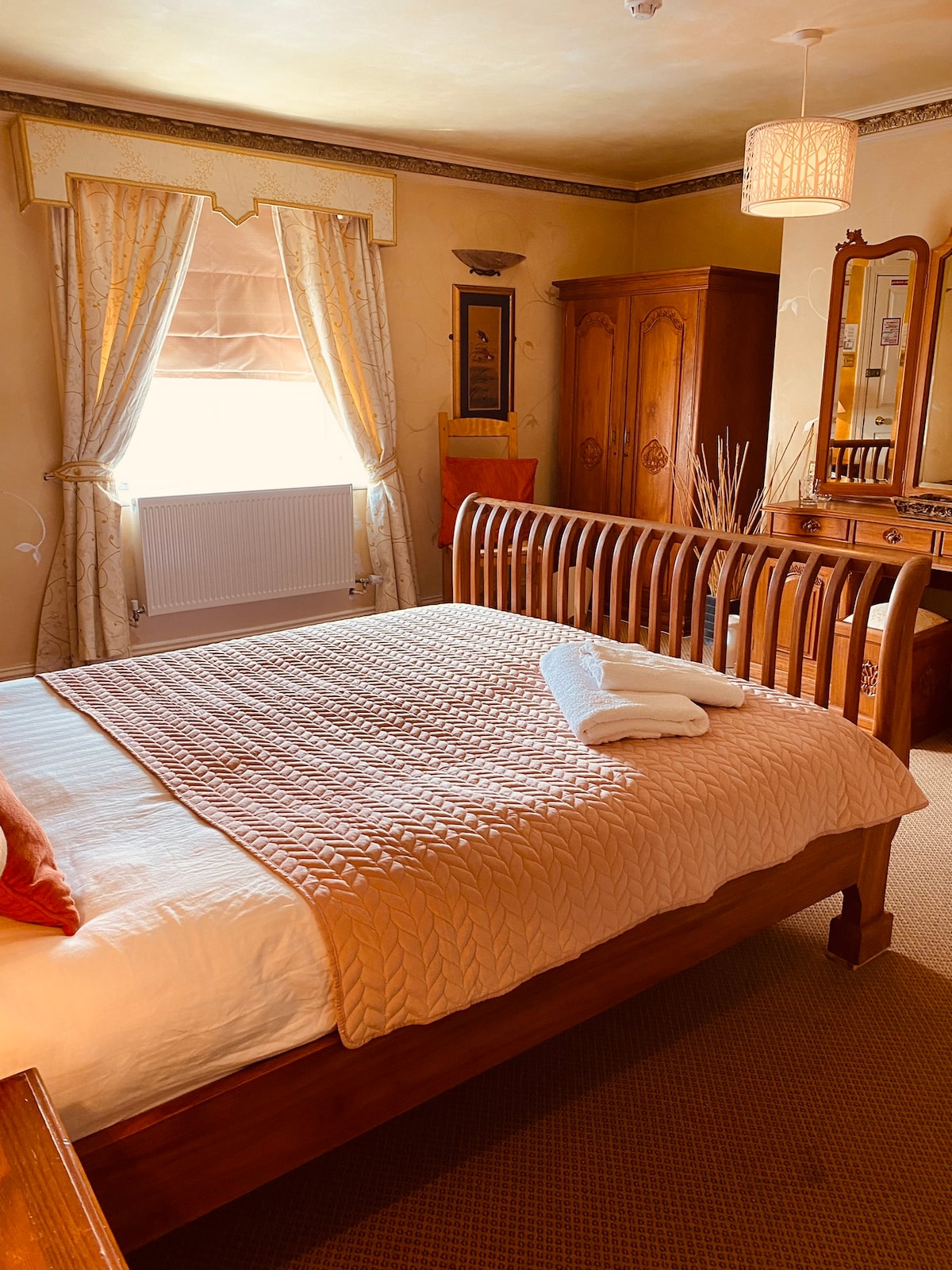 What kind of bedroom would a reasonably successful motor trader sleep in after a day shifting a bit of metal? A room like this, we reckon. It's one of our biggest bedrooms with our biggest bed (obviously: size matters), most of the furniture almost matches and even the cushion and throws are 'in period'.