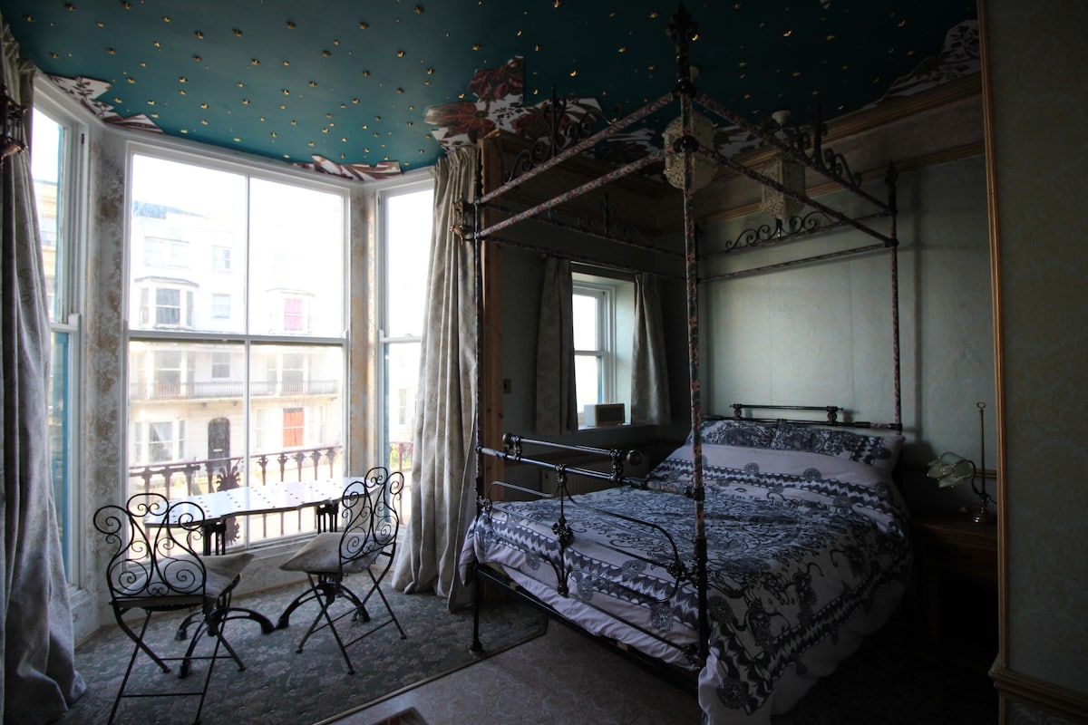 A uniquely designed and decorated fantasy suite. Unlike anywhere else. With beautiful decor, artworks, and custom created pieces of furniture that accentuate the total design of the room. It is a very large space with a double bed, a comfortable lounge area with luxurious cream leather L shaped sofa, and a dining area set in a big bay window with sideways views of the sea. En suite shower and WC. There is a kitchen area with sink, fridge, microwave, kettle, and toaster. Central heating and WiFi