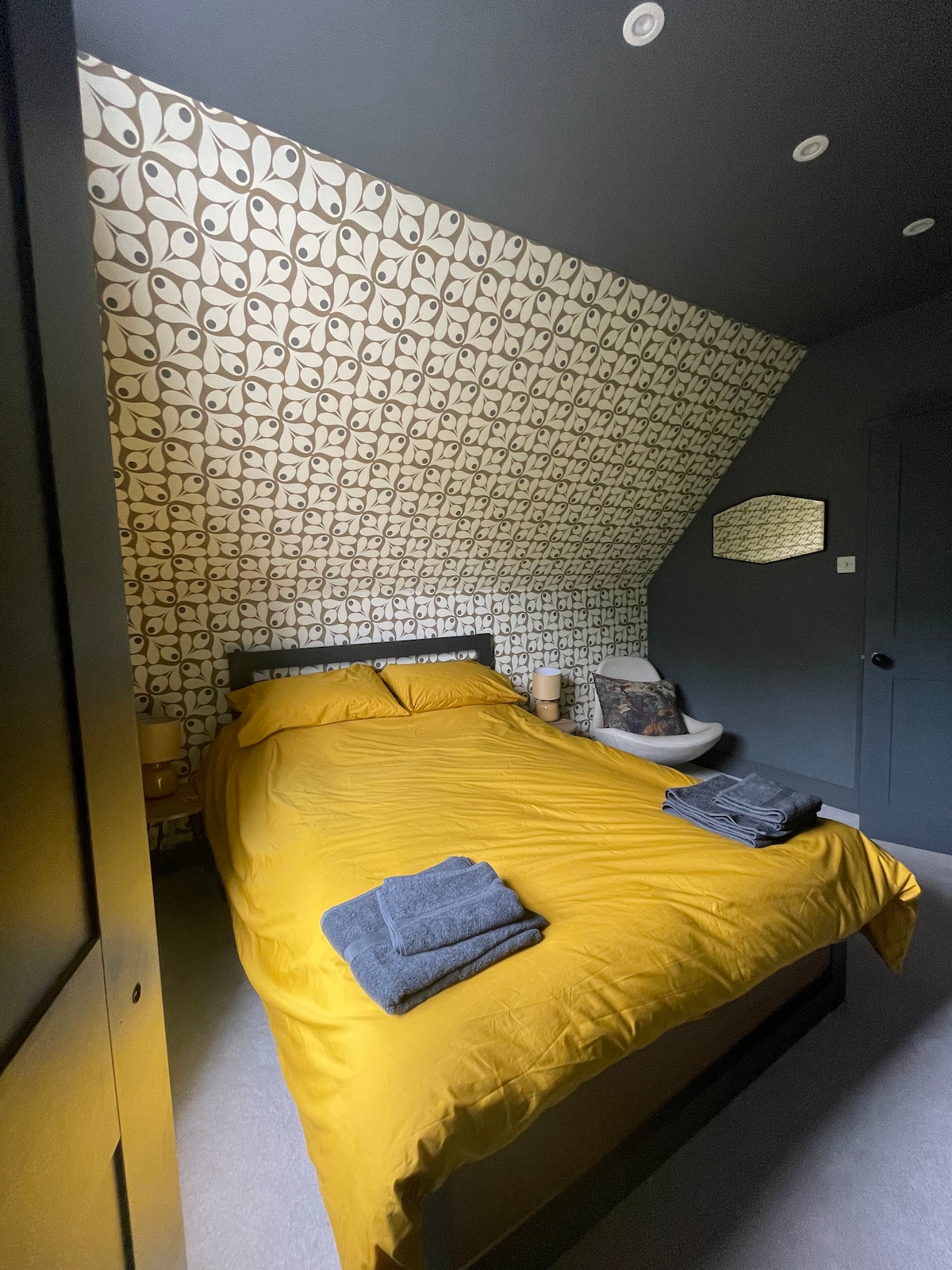 Enter the flat by a spiral staircase into a welcoming, warm and comfortable space. The flat has retro inspired furniture and furnishings throughout. The sitting/dining room is a warm blue with little pops of colour, and has a great view over the garden to relax and have breakfast with. The kitchen and bathroom have a quirky design, and are clean and fresh feeling, having all the amenities you need. The bedroom has a comfortable standard double bed, blackout curtains and lots of hanging space.