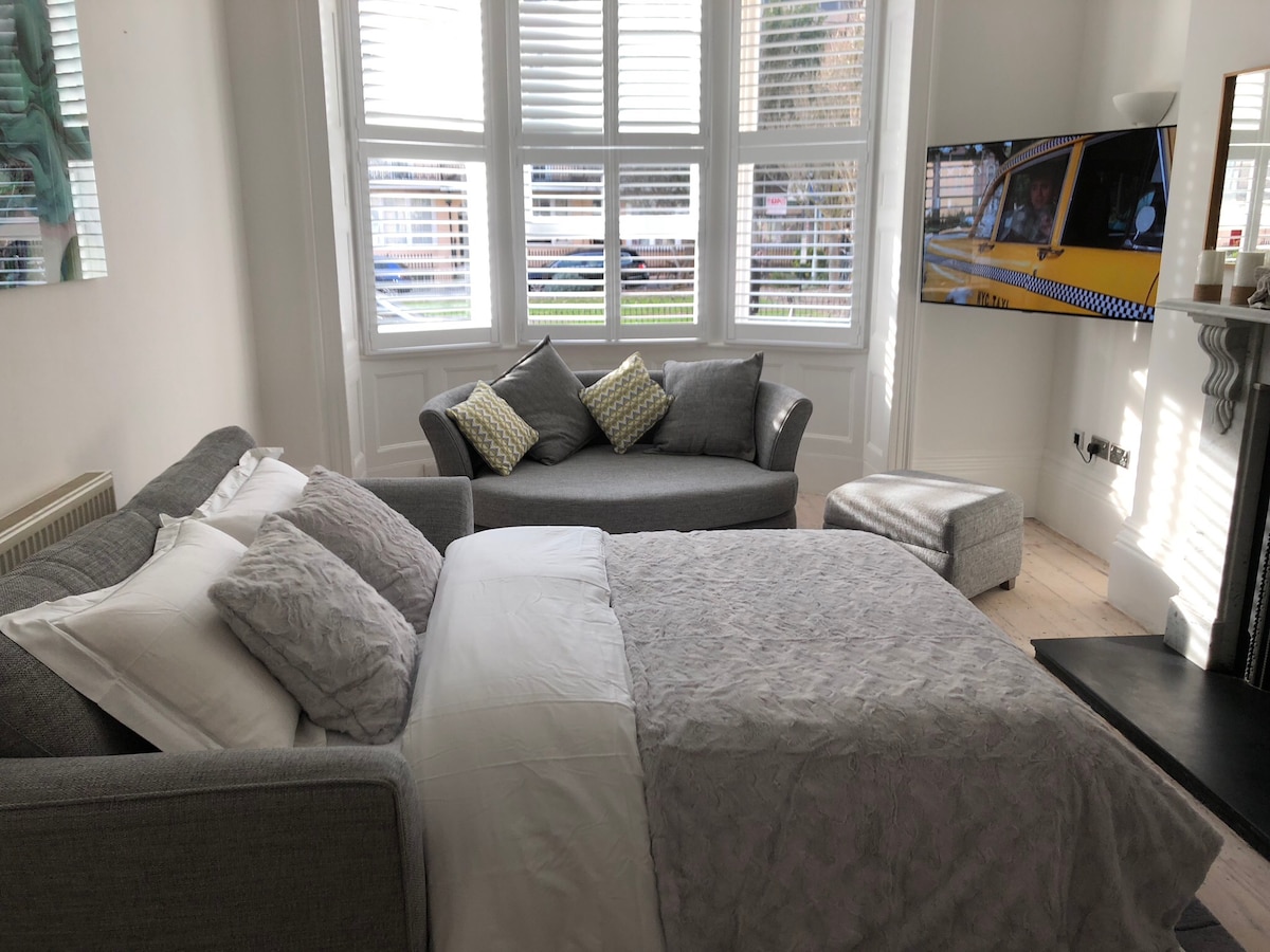 A very spacious and sunny 2 double bedroomed South-facing seafront garden flat. Huge open plan living/dining/workspace 25x21 feet max. 9 foot by 7-foot L-shaped leather sofa, and modern dining suite. Bespoke luxury fitted kitchen. Both rectangular bedrooms have en-suites, walk-in wardrobes, and brand-new pure cotton bed linen. Over 85m2 in total floorspace. If you are using Airbnb for the first time, please message us with the names,ages,occupations etc. of your party and have verification done.