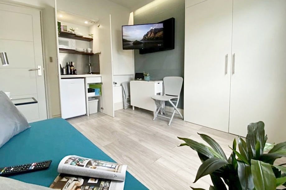 Enjoy a stylish and comfortable experience at this centrally-located pied-a-terre in the heart of Kemptown. This little ‘micro flat’ has everything you need for a convenient stay, just 3 mins walk from the seafront in the Bohemian quarter of Brighton. Comfortable bed, en suite shower, kitchenette with microwave, fridge, kettle and toaster, a Smart tv, a table to sit at and work/dine. There is outside space to the front of the flat (facing the street side), with a patio table and chairs.