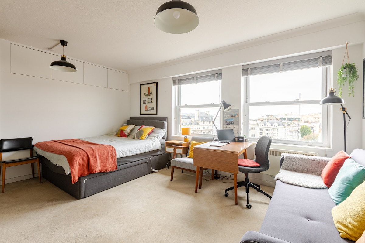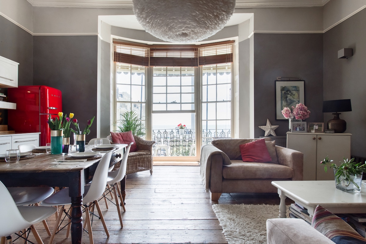 Enjoy a 5 star stay on Brighton seafront - stunning 180° sea views and balcony. Bottle of fizz on arrival 🍾 Avoid the stress/expense of Brighton parking with your own parking space. In an iconic Regency building by the beach, a short walk to the pier or Lanes and many restaurants, the flat has everything you need for a great mini break or longer stay for couples, friends or families. Fully equipped kitchen, slipper bath, 4 poster bed, master with superking or twins, washer & dryer, Sky TV.