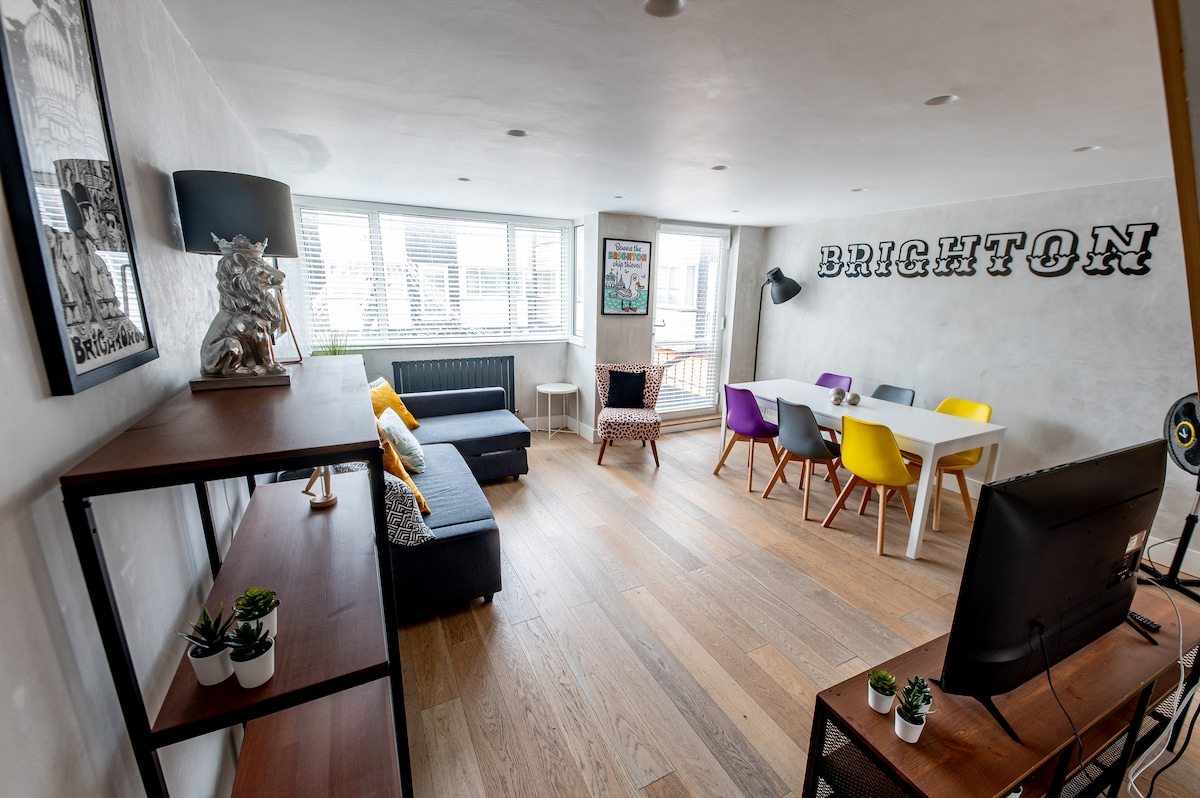 **Scaffolding April May June 2026 - additional discounts available - please enquire** Last minute and long stay discounts available. Fresh and stylish self catering apartment situated close to the lively heart of Kemptown and the beach. Open the shutters on the ground floor to reveal sea views along to the Palace Pier. Take an amble down to Madeira Drive for the beachfront bars and cafes. Take a trip on the zip wire or ride the worlds oldest electric railway. A great base to explore Brighton.