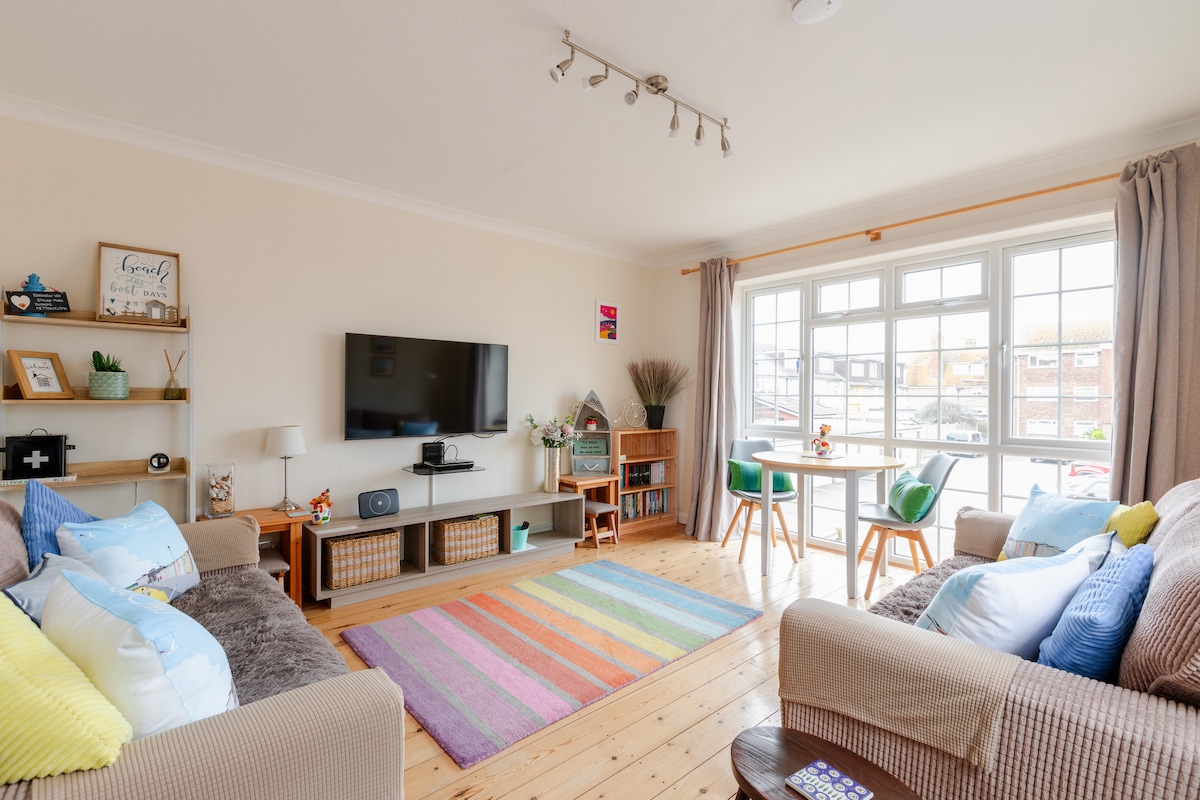 Welcome to my spacious and inviting flat, just a 2-minute stroll from the beach! A true home-away-from-home, the heart of it is the expansive kitchen and open living area, where you can unwind on plush sofas surrounded by cozy throws. It's the perfect space to relax and whip up a meal after a day of exploration. Tucked away at the back of the flat, the bedrooms offer a quiet and tranquil retreat. The natural colours and calming hues create a peaceful ambience, ensuring a restful stay.
