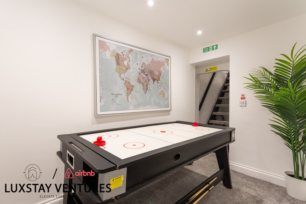 A Brighton Airbnb with its own games room - something you almost never find here. Pool table, table tennis, and air hockey downstairs. Two bedrooms (super-king or twins), two bathrooms including en-suite, open-plan living. Sleeps 8 comfortably. Free parking included. Hanover: 3 min to Queens Park, 15 min to the beach, 12 min to North Laine. 224 Mbps WiFi throughout Luxstay Ventures is a serviced accommodation business in the UK. **Book Direct for Generous Discounts**