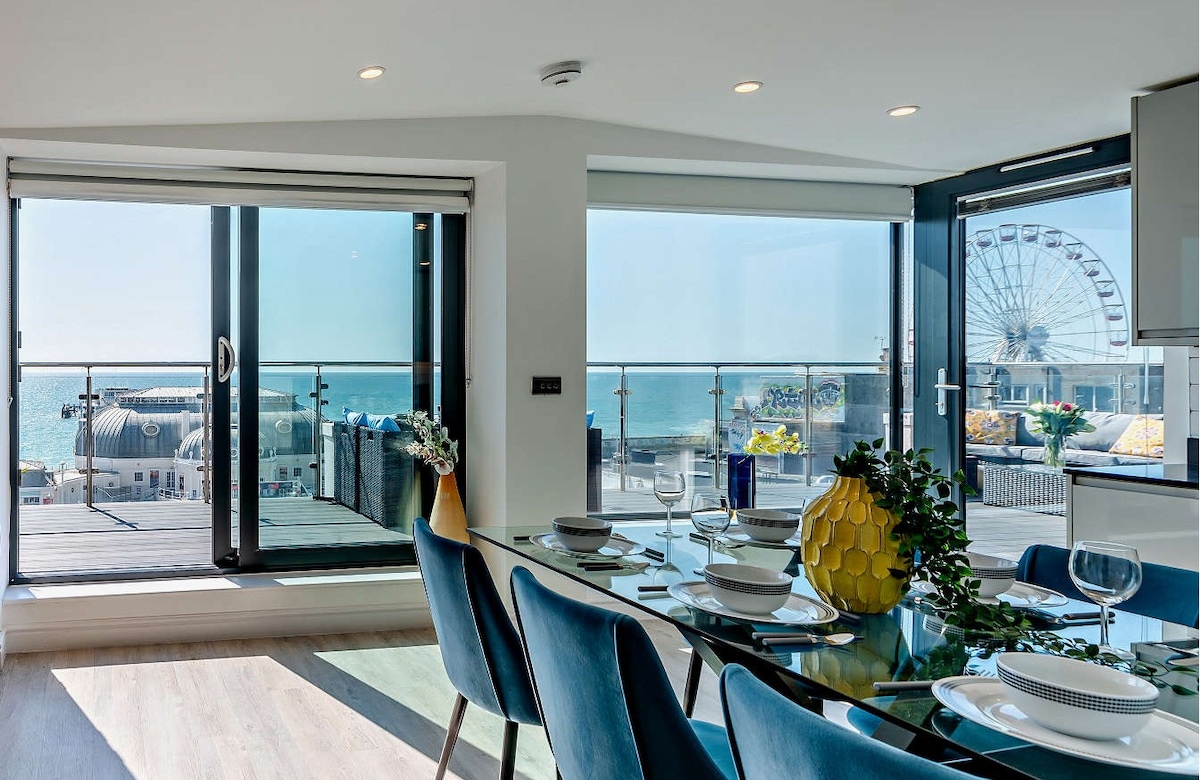 Sleek 5th-floor penthouse with panoramic sea views, a wraparound south-facing terrace, and modern open-plan living. Just steps from Worthing beach and pier, this stylish retreat has two bedrooms (king with ensuite, twin convertible to super-king), floor-to-ceiling windows, Smart TV, and a fully equipped kitchen. Enjoy alfresco dining, sunsets, and easy access to shops, cafes, coastal walks, and vibrant Brighton, just 10 miles away.
