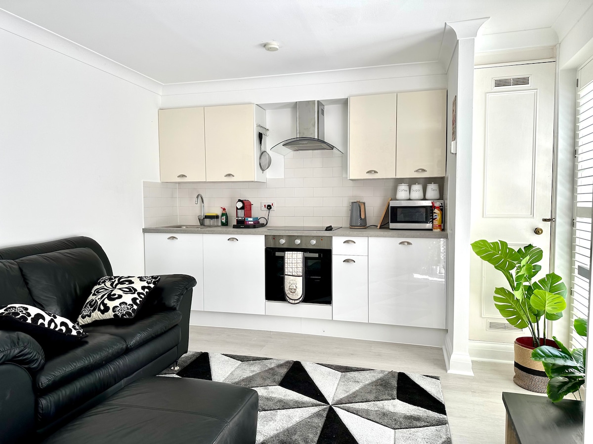 Bright, stylish 1-bed apartment with a spacious garden, ideal for sunny BBQs. Just 2 mins from the beach and 5 mins from Brighton’s center. Enjoy restaurants, bars, cafes, shops, and the beach right at your doorstep. Newly refurbished, the flat features a BBQ, a fully equipped kitchen, a dining/working table, and a cozy outside sofa, as well as an inside TV area with a smart TV and major streaming services. The bedroom has a king size bed and a large cupboard with hanging space.
