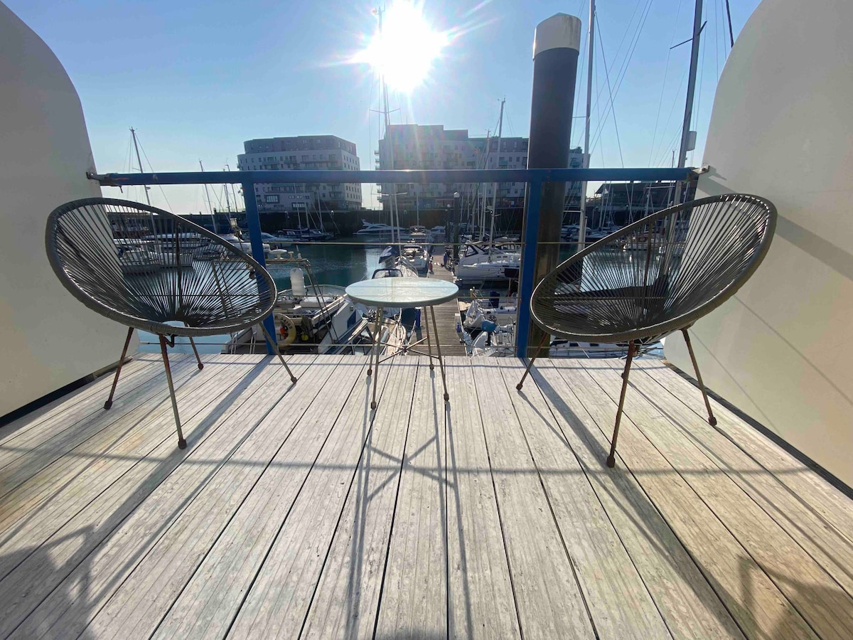Enjoy a memorable stay in Brighton at our unique floating home on the Eastern Jetty of Brighton Marina with stunning views across the water and just a short walk to all of the restaurants, pubs & shopping in the marina complex There is free parking in a car park 2 mins walk from the apartment. Brighton centre is just a short bus or cab ride away Sea Breeze has everything you need including quality bedding, coffee machine, cooking facilities, large smart tv and a great South/West facing balcony