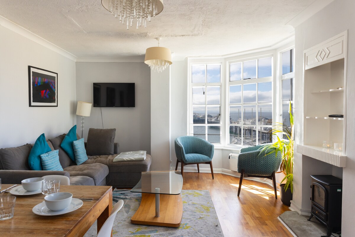 **Scaffolding April May June 2026 - additional discounts available - please enquire** Last minute and long stay discounts available. Fresh and stylish self catering apartment situated close to the lively heart of Kemptown and the beach. Open the shutters on the ground floor to reveal sea views along to the Palace Pier. Take an amble down to Madeira Drive for the beachfront bars and cafes. Take a trip on the zip wire or ride the worlds oldest electric railway. A great base to explore Brighton.