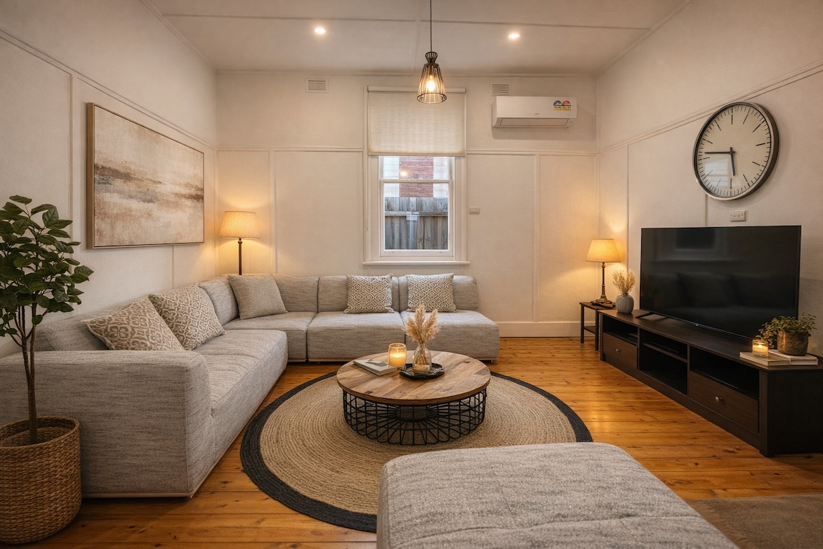 Inner-city townhouse on a quiet suburban street 9km from Melbourne CBD. 4 mins walk to the train station which takes you directly to Southern Cross. Extremely light and welcoming. Recently renovated with brand new appliances and 55" smart TV. Fully air-conditioned. Two bedroom with very comfortable double beds and a sofa bed in the lounge area. Outdoor alfresco area. 2 mins walk to local shops. Study nook, High speed 50mbs NBN internet. Washing machine & tumble dryer. OSP and small back garden.
