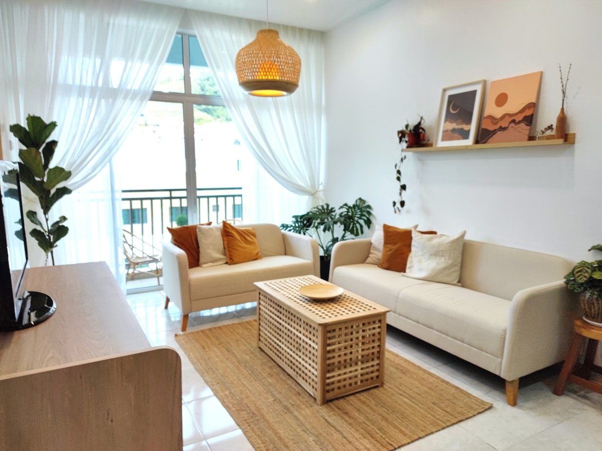 Welcome to MyUrbanGetaway, our 2nd & boldest listing yet. Located smack center in bustling Tanah Rata, we assure you the best highland experience this little town of ours has to offer. 5 floors up in the Cameron Fair mall complex, housing the Avillion Hotel as well as eateries like Old Town White Coffee and the delightful Naux Pastry Cafe, treat yourself to a posh yet comfy retreat with our newly renovated and fully stocked 2 bedroom unit, perfect for plant-lovers and boho-chic enthusiasts.