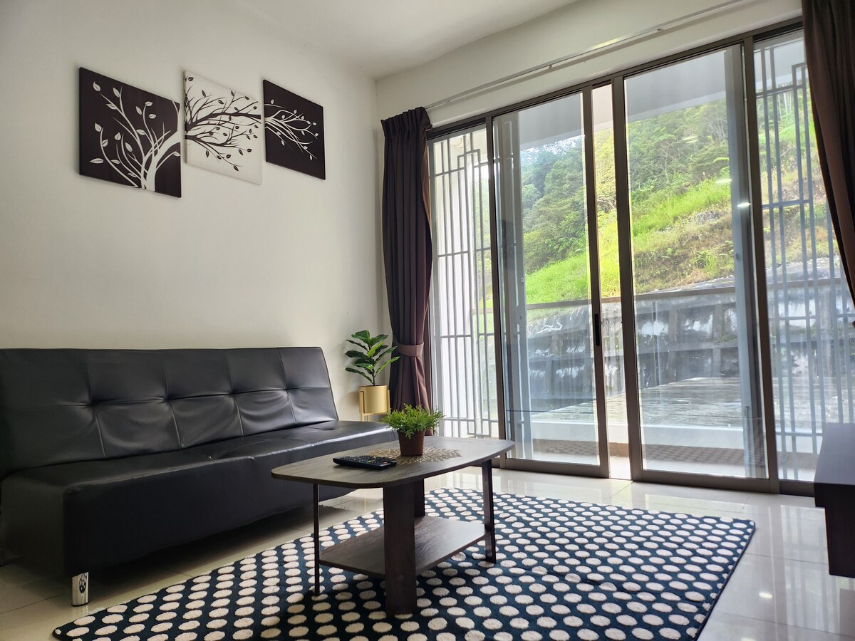 Entire 2 bedroom, 2 bathroom apartment with living, dining areas and a balcony. For families of up to 7 persons (maximum). Good location, Tanah Rata and Brinchang towns are less than 10 mins away by car. NO PUBLIC TRANSPORT AVAILABLE and not suitable if not driving. Pasar Malam, minimarts, convenience stores, restaurant down stairs. Free 100mbps WIFI and android TV with YouTube. Cooking not allowed (including steamboat). Microwave available to reheat precooked food and cutlery to dine indoors.