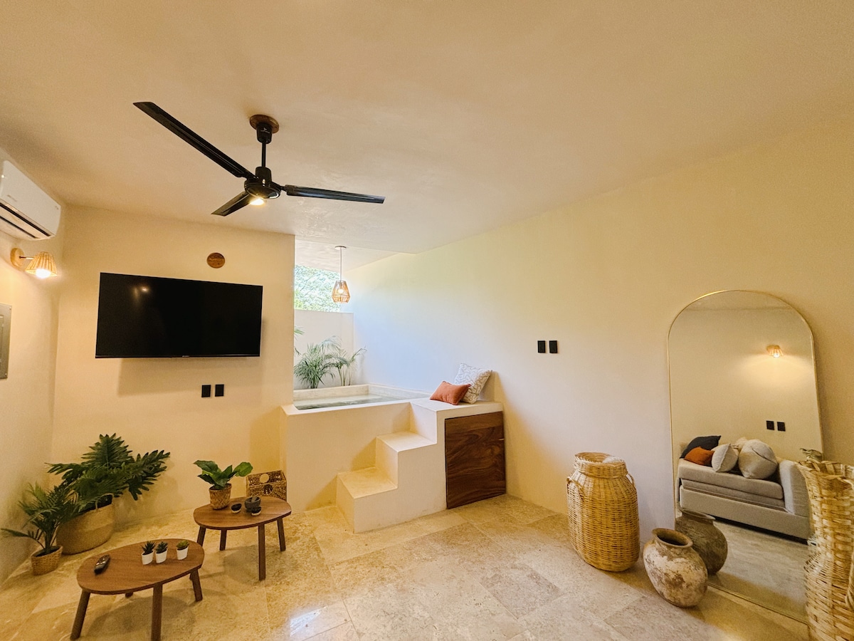 Relax in this unique and peaceful getaway. Enjoy this cozy apartment for 2 guests, just a few minutes’ walk from the beach and the main street. Located on the 2nd floor, it features a bedroom with a king-size bed, air conditioning, TV, and a workspace. The open living area, located under a palapa roof, connects directly to the small pool with a partial ocean view, plus Starlink Internet and a fully equipped kitchen. Perfect for unwinding after a day at the beach.