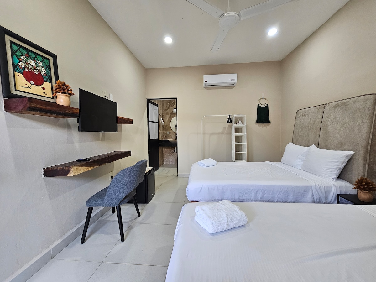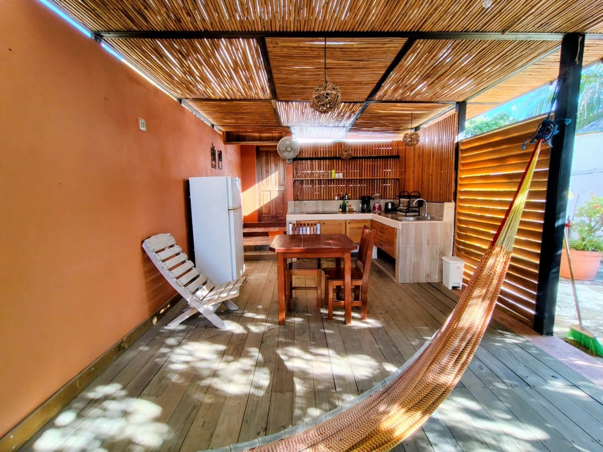 Depa amplio y luminoso en planta alta con 2 camas queen súper cómodas, A/C en la recámara y ventiladores en sala y cocina. Cuenta con cocina equipada, salita acogedora y balcón con vista a palmeras. Estás a solo 2 min de la playa y a 1 min de cafés, tiendas y restaurantes. Disfruta el patio compartido con hamacas, árboles frutales, asador y área de pesas artesanales. Ideal para relajarte, surfear o trabajar remoto con buena vibra.