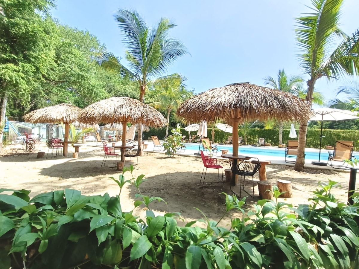 In Aldeita Mixteca you wake up listening to the world's famous waves to surf. Have breakfast on the beach. Cook outside. Cool off in the pool that has a swing rock while your feet touch the water. Under the shade of the large palm tree, you can go up to a view deck, where is a 6 meter bar and enjoy a privileged view of the sea. Stay conected in line with starlink wifi It has a minibar, coffee maker and is in residential area