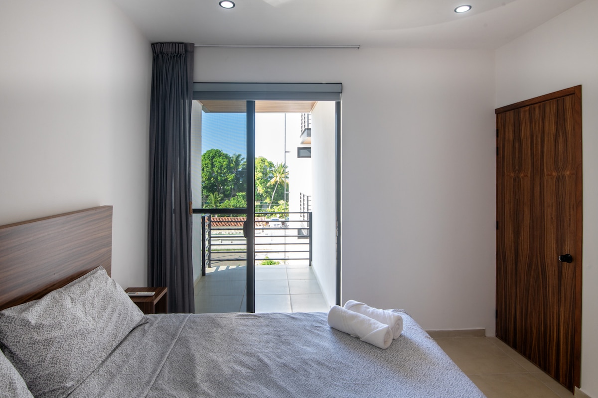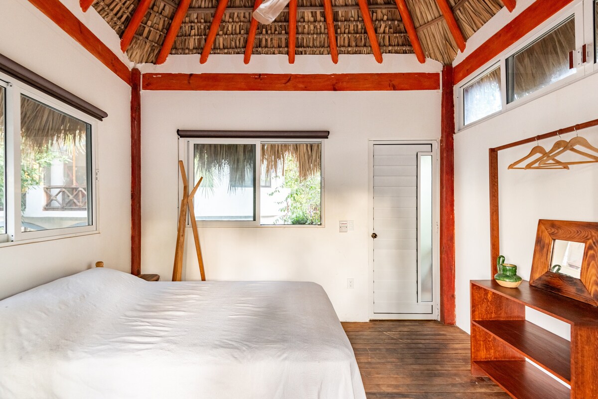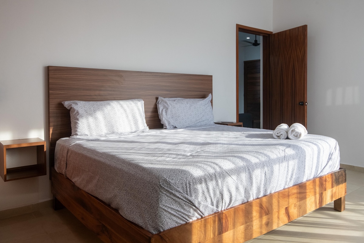 Depa amplio y luminoso en planta alta con 2 camas queen súper cómodas, A/C en la recámara y ventiladores en sala y cocina. Cuenta con cocina equipada, salita acogedora y balcón con vista a palmeras. Estás a solo 2 min de la playa y a 1 min de cafés, tiendas y restaurantes. Disfruta el patio compartido con hamacas, árboles frutales, asador y área de pesas artesanales. Ideal para relajarte, surfear o trabajar remoto con buena vibra.