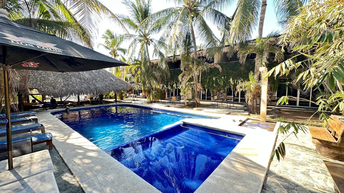 Relájate en esta amplia habitación con 2 camas matrimoniales y baño privado. Disfruta de una pequeña alberca y una terraza compartida con vista al mar, perfecta para ver el atardecer o leer un libro. Estamos a solo 3 minutos caminando de la playa y a 5–10 minutos de los mejores bares y restaurantes de Zicatela. Ideal para desconectar y sentir la vibra de Puerto Escondido.