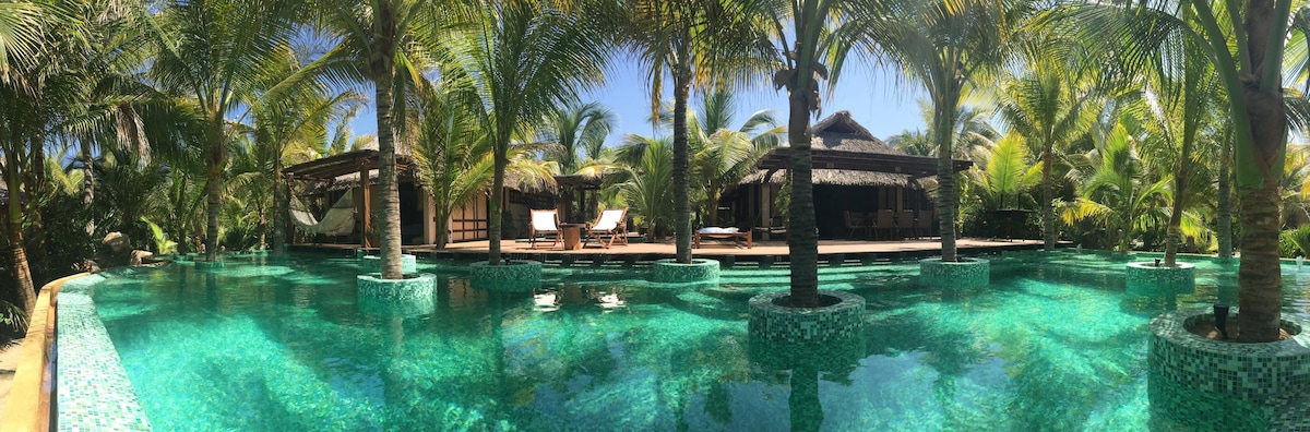 Casa Viva is hidden in the heart of an immense garden, surrounded by palm trees, trees, plants and flowers that make this place a space of peace and tranquility where you can rest comfortably. This is located two blocks from the beach, right halfway between Zicatela and la Punta beaches, one of the favorites for lovers of surfing and good life. A space where you will feel at home